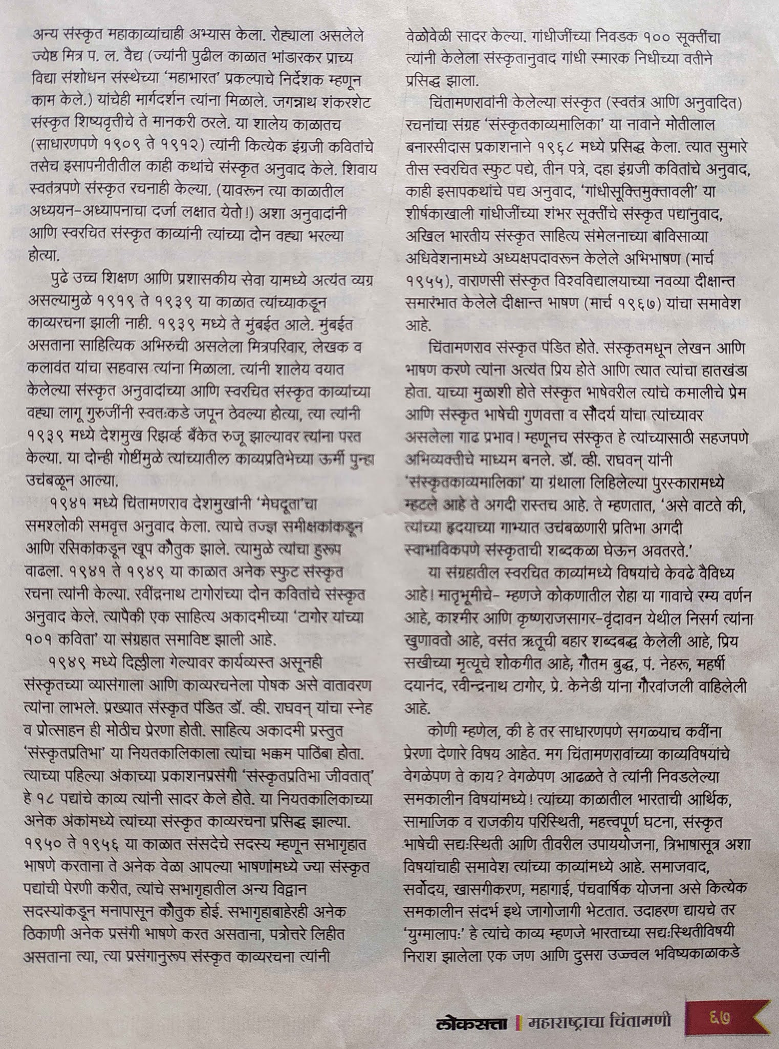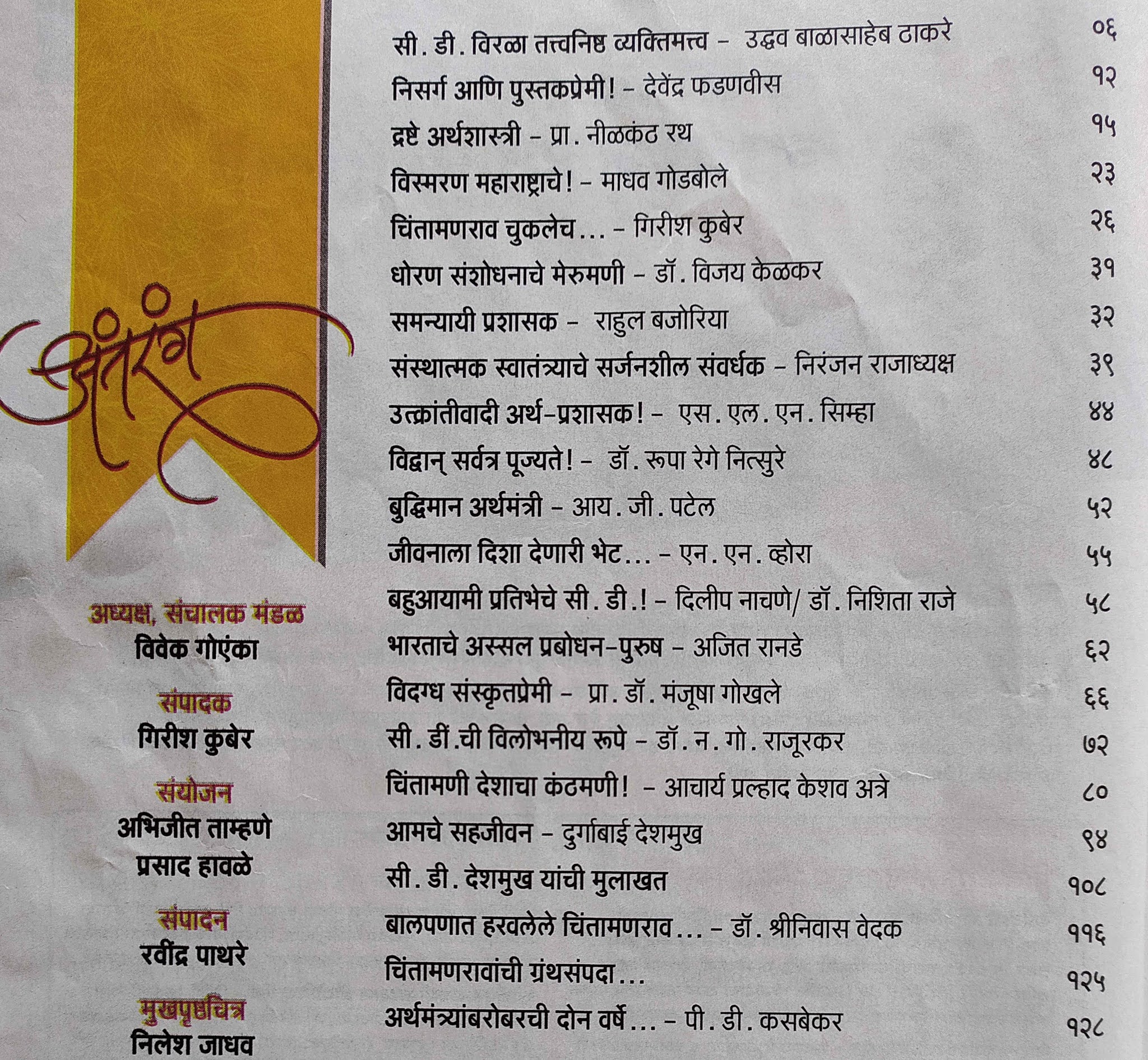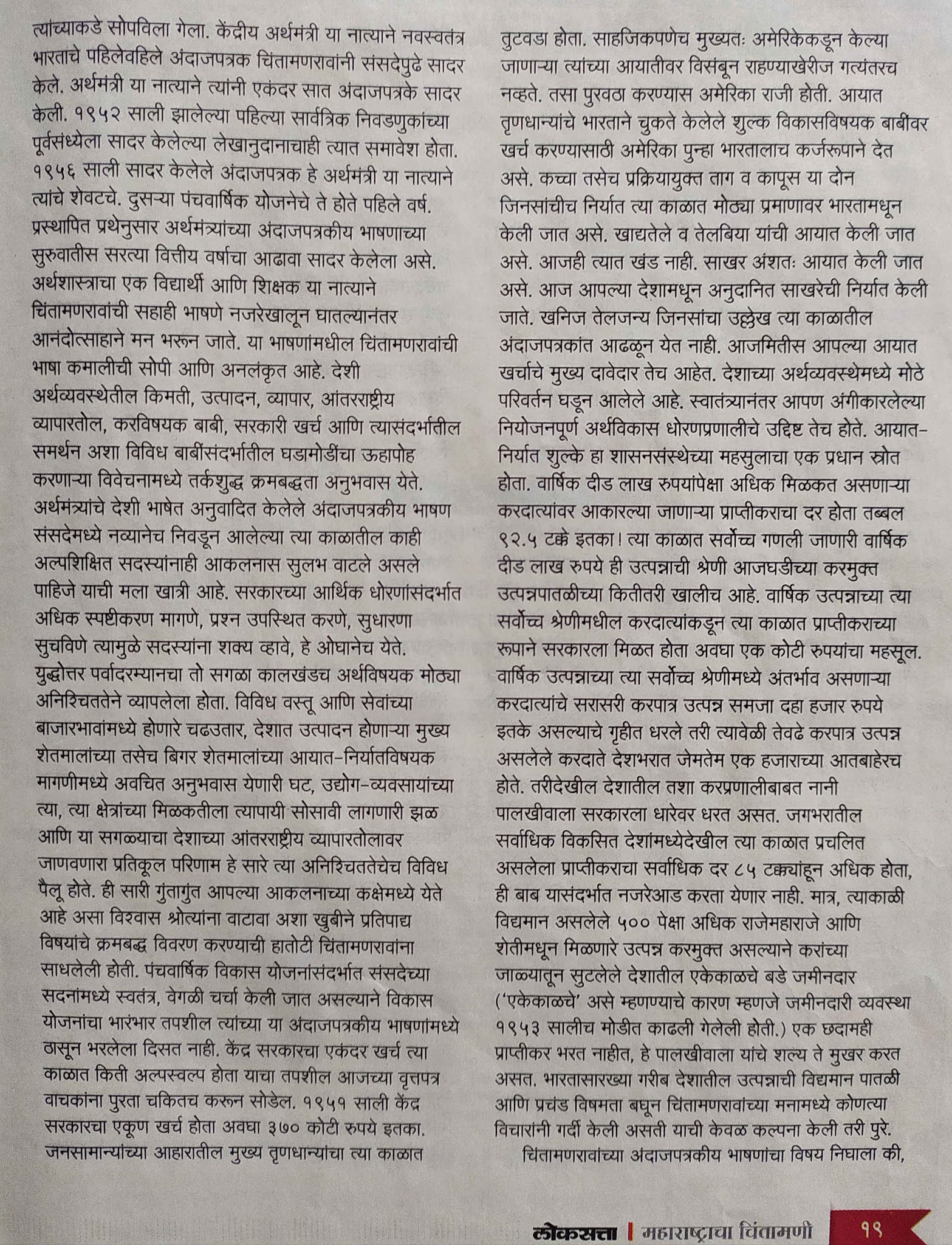 या विशेष अंकाची कल्पना आपल्याला आली असेलच. अतिशय वाचनीय आणि संग्राह्य असा हा विशेषांक आहे. लोकसत्ता परिवाराने हा आगळावेगळा उपक्रम राबवून वाचकांना मोठी भेट दिली आहे. अनेक वाचक हा विशेषांक वाचून चिंतामणरावाबद्दल अजून वाचायला उद्युक्त होतील आणि प्रेरणा घेतील हीच सदिच्छा.