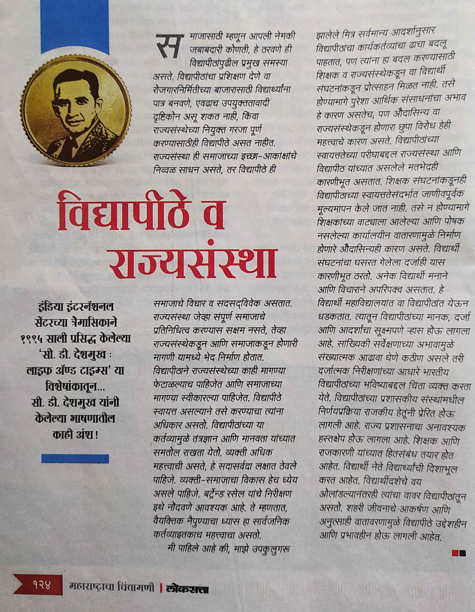दुसरे म्हणजे; अर्थमंत्रीपदाचा राजीनामा दिल्यावर त्यांनी संसदेत सडेतोड भाषण केलं आणि नेहरू हे एकाधिकारशाही पद्धतीने वागत आहेत असा जाहीर आरोप केला. आपली भूमिका महाराष्ट्र किंवा गुजरात यातल्या एकाच्या बाजूने नाही तर मुंबई केंद्रशासित करण्याच्या नेहरूंच्या एकतर्फी निर्णयाच्या विरुद्ध आहे हे त्यांनी मांडले. या भाषणाचा आणि त्याच्या प्रभावाचा उल्लेख बऱ्याच वेळा लेखांमध्ये आला आहे. त्यामुळे ते भाषण संक्षिप्त स्वरूपात का होईना या अंकात यायला हवे होते. सीडींच्या जीवनाचे महत्त्वाचे टप्पे मांडणारी कालसूची/कालानुक्रम द्यायला हवा होता. म्हणजे पूर्ण कार्य एका नजरेत बघता आलं असतं. त्यांनी किती वर्ष देशसेवा केली आणि एका वेळी किती वेगवेगळी कामं ते करत होते ते अजून परिणामकारकरित्या मांडलं गेलं असतं.