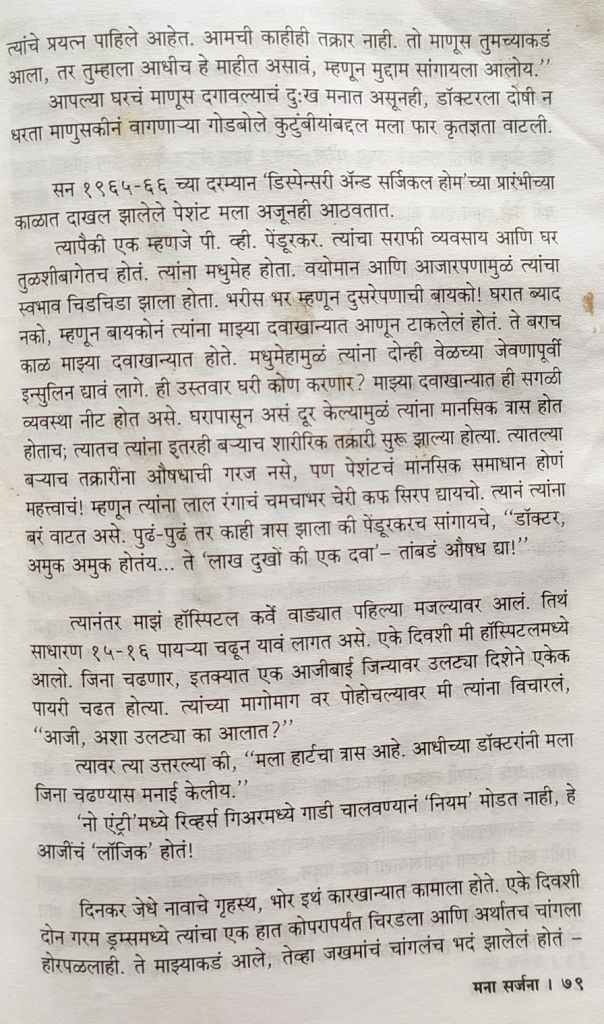 पुढे त्यांनी छोट्या जागेत प्रॅक्टिस सुरू केली. त्यांच्या हाताला येणारं यश, सचोटीची वागणूक, रुग्णांप्रती सहृदयता यातून नाव, पैसा, प्रसिद्धी आणि समाधान मिळत गेलं. व्यवसायसुद्धा वाढला. हा प्रवास पुस्तकात सांगितला आहे. काही लक्षात राहिलेल्या केसेस सांगितल्या आहेत. उदा.