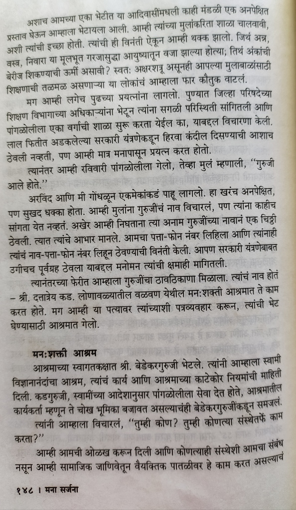 अनिल गांधींसारखा सहृदय माणूस व्यावसायिक स्थैर्य आल्यावर सक्रिय समजकार्यात न उतरता तरच नवल. त्यांनी लोणावळ्याजवळ एका आदिवासी पाड्यात तिथल्या आदीवासींना मोफत उपचार द्यायला सुरूवात केली, पुढे त्यांच्यासाठी शाळा काढली. ह्या उपक्रमाची सुरुवात कशी झाली, साथीदार कसे मिळाले, लक्ष्मीनिवास मित्तल यांच्यासारख्या प्रसिद्ध उद्योगपतीची साथ मिळाली इ. सांगितलं आहे.