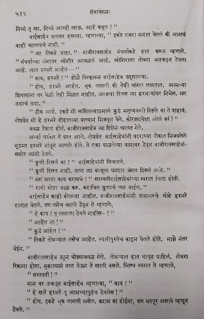 कादंबरीच्या सुरुवातीच्या भागात त्यावेळचं भरलेलं, बहरलेलं पुणे शहर; त्यात होणारे सण-उत्सव, नाचगाण्याचे कार्यक्रम, पेशव्यांचा लवाजमा यांचं वर्णन प्रसंगोपात येतं. यातून एका समृद्ध राज्याची कल्पना येते.