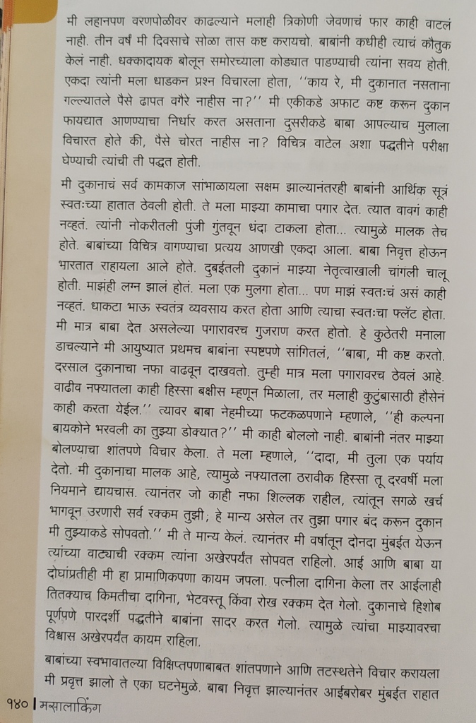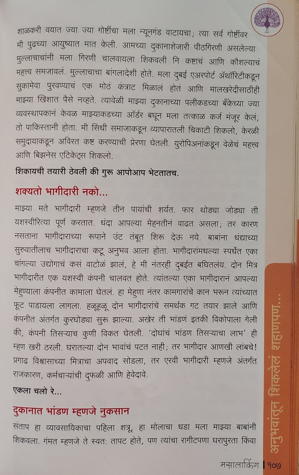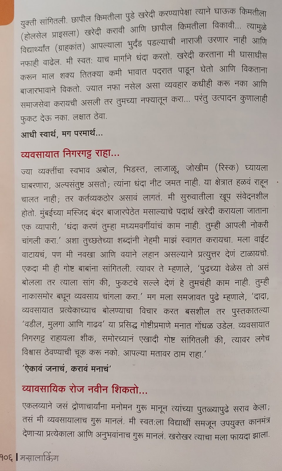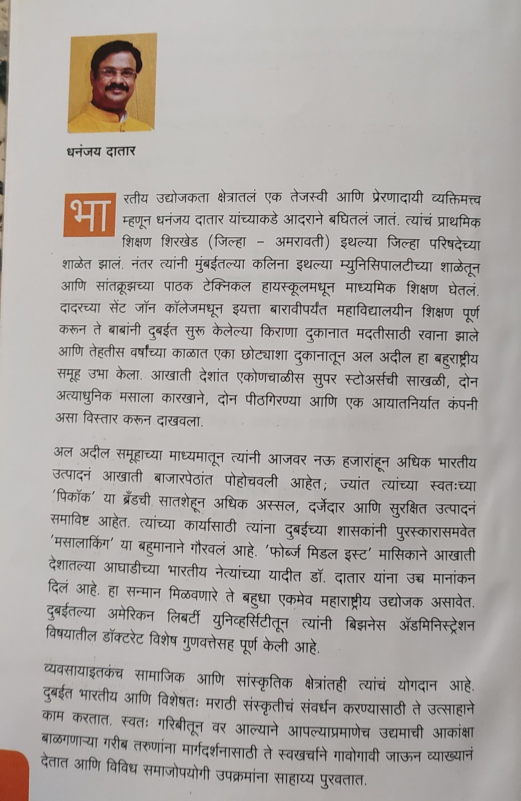 मराठी माणूस सहसास धंद्यात पडत(!) नाही. पण पडलाच तर निग्रहाने पडतो. सर्वोत्तम व्यवसाय करण्याची त्याची इच्छा असते. त्यासाठी मेहनत घ्यायची इतकी तयारी असते की पुढे त्याचे यश सर्वांना अचंबित करते. अशा यशस्वी उद्योगपती पैकी धनंजय दातार आहेत. दुबई आणि आखाती देशांमध्ये त्यांचा मसाल्याचा व्यापार व्यापार आहे. या व्यापाराचा दबदबा इतका आहे की प्रत्यक्ष दुबईच्या राजघराण्यातल्या व्यक्तीने त्यांना “मसालाकिंग” म्हणत गौरवले होते. त्यांच्याबद्दल पुस्तकात दिलेली थोडी माहिती.