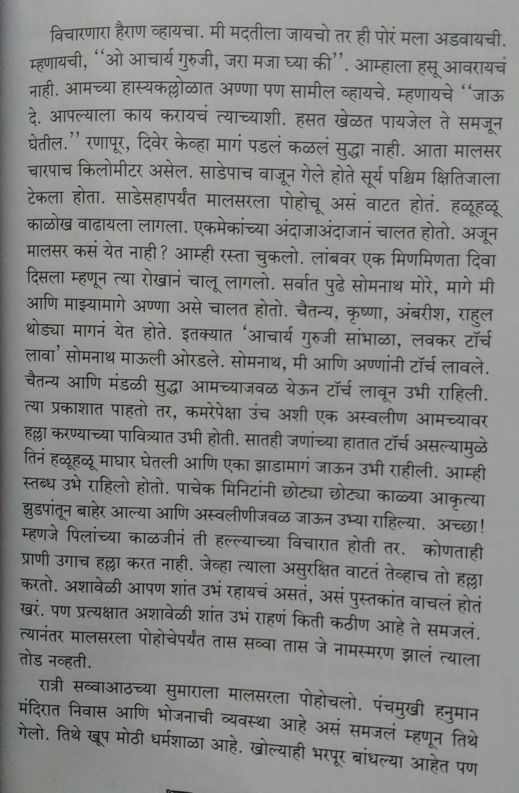 परिक्रमेवरचे गो.नि.दांचे कुणा “एकाची भ्रमणगाथा”, जगन्नाथ कुंटे यांचं “नर्मदे हर हर”, आणि ध्रुव भट्ट यांचं गुजराथी “તત્ત્વમસિ” ही पुस्तके आधी वाचली होती. तरी प्रत्येकाचे अनुभव वेगळे, सांगायचे कथाभाग वेगळे, शैली वेगळी. त्यानुसार हे चौथे पुस्तक असले तरी वेगळेच आहे.
