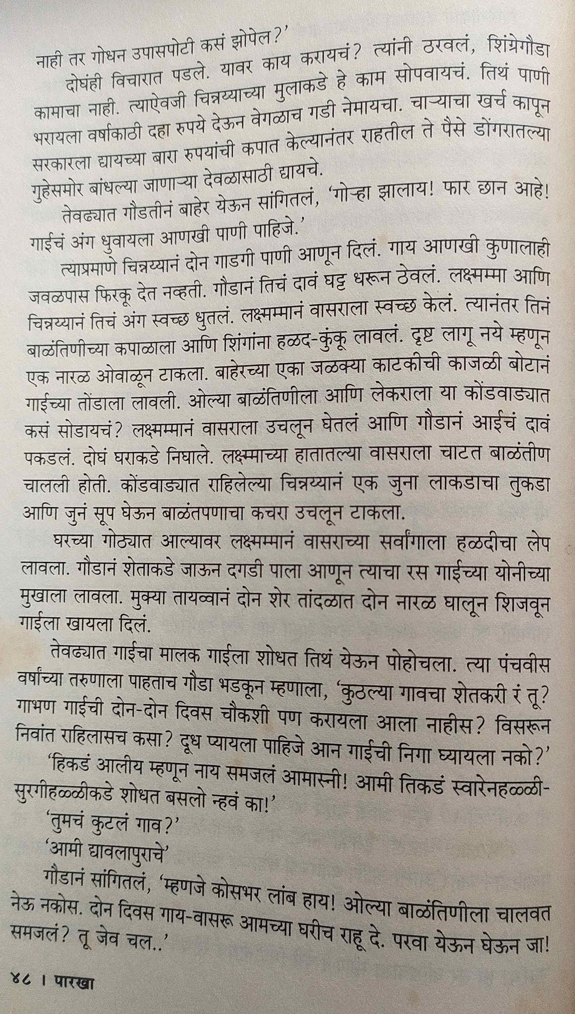 वाचताना मला असं वाटलं; की गाय आपल्याला दूध देते म्हणून आपण गायीला देव मानतो. पण मग म्हशीला का नाही ? मांसाहार सुद्धा पूर्ण भारतात वर्ज्य नाही. वेदांमध्ये सुद्धा पशुबळीचे उल्लेख आहेत. केवळ “कमी दर्जाची उपासना पद्धती” म्हणून तिची बोळवण करता येईल का ? पुस्तकातला काळींगा आजोबा म्हणतो, “वासरांनी पिऊन जेवढं दूध राहील तेवढंच आपण घ्यायचं. आपण गाईंना भरपूर खायला घातल्यामुळे जेवढं जास्तीचं दूध मिळेल तेवढंच आपलं.” हा विचार खूप भूतदयावादी वाटतो. पण खायला प्यायला घालून गायींन जास्त दूध द्यायला लावणं हा सुद्ध्य त्यांच्यावर अत्याचारच नाही का? माणसाला हवं त्याच वाळूबरोबर गायीचा संग घडवून आणणं हे सुद्धा परंपरेतच आहे. यात कुठे आहे गायीच्या भावनांचा विचार ? इथे भारतीय समाज सुद्धा गाईला उपयुक्त पशूच समजतो आहे ना ? दुसरीकडे असं दिसतं की पाश्चात्त्य देशांमध्ये दूध, मांसासाठी जनावरांची पैदास करणे, शेतीच्या रसायनीकरणातून उत्पादन वाढवणे आणि बेसुमार जंगलतोड यातून झालेला फायदा हळूहळू या पृथीलाच नाशाच्या उंबरठ्यावर नेट आहे. मग असं वाटतं की कोणे एकेकाळी आपल्या समाजाची अवस्था सुद्धा आजच्या पाश्च्यात्त्य समाजासारखीच असेल. निसर्गाचा उपभोग घेता घेता हळूहळू आपल्या पूर्वजांच्या लक्षात आलं असेल की निसर्गाकडून कितपत “घेतलं” आणि कितपत “परत दिलं” की आपला स्वार्थ आणि निसर्ग याचा समतोल राहतो. आणि त्यातून आपल्या संस्कृतीतल्या प्रथा परंपरा यमनियम बनले असतील. आता त्यातलं विज्ञान. अर्थशास्त्र, दूरदृष्टी आपण विसरलोय आणि राहिलेत फक्त पोथ्यांमधले नियम. त्यामुळे ऐहिक जगण्याच्या प्रश्नांना या भावनिक नियमांची उत्तरे थिटी पडतायत. पुन्हा एकदा निसर्गाचा जास्तीत जास्त वापर, त्याचे दुष्परिणाम, त्यातून आलेली समज आणि मग एक समंजस संस्कृती या प्रवासावर पाश्च्यात्य देशांच्या साथिने आपण निघालो आहोत !!