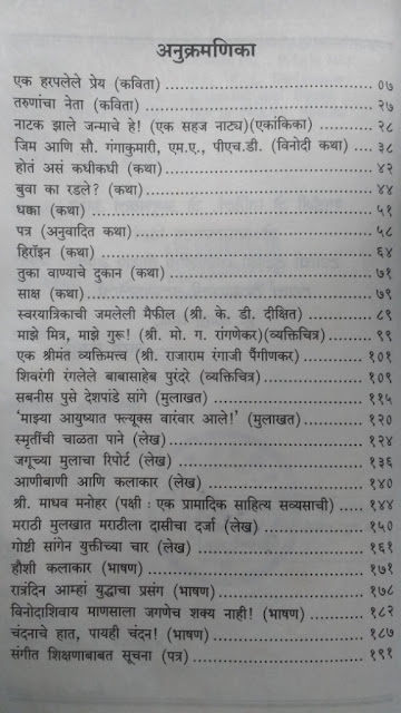 पूर्वी वेगवेगळ्या मासिकांत, व्रुत्तपत्रांत, पुस्तकांत प्रसिद्ध झालेल्या पुलंच्या कथा, कविता, भाषणे, लेख, मुलाखती यांचा समावेश या पुस्तकात आहेत. पुढीलप्रमाणे.
