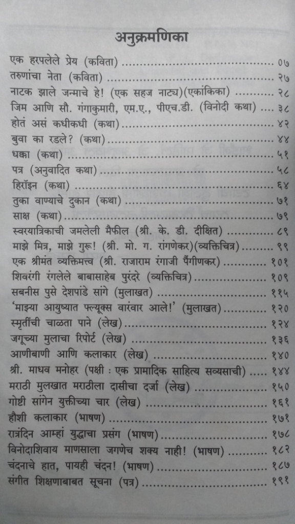 पूर्वी वेगवेगळ्या मासिकांत, व्रुत्तपत्रांत, पुस्तकांत प्रसिद्ध झालेल्या पुलंच्या कथा, कविता, भाषणे, लेख, मुलाखती यांचा समावेश या पुस्तकात आहेत. पुढीलप्रमाणे.