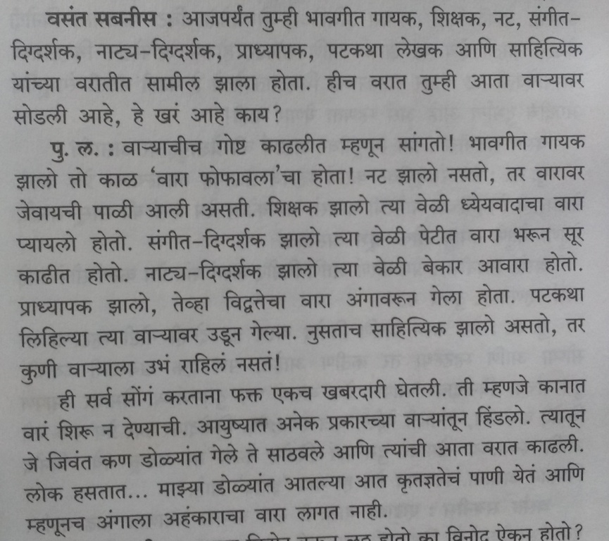 वसंत सबनिसांनी पुलंची घेतलेली एक मजेशीर मुलाखत आहे. या सबनीस आणि पुलांची शाब्दिक कोट्या आणी शब्दांचे खेळ करणारी प्रश्नोत्तरे आहेत उदा.