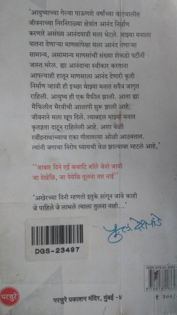 ज्यांनी पुलंचं फक्त विनोदी लिखाण वाचलं आहे त्यांना हे वैचारिक लिखाण पुलंच्या व्यक्तिमत्त्वाचा नवा पैलू दाखवेल. मलाही पुन्हा एकदा प्रकर्षाने जाणवलं की या लिखाणामगे एक संवेदनशील, सर्वसमावेशक, निखळ गुणग्राही व्यक्ती आहे. त्यांचं म्हणणं आहे की प्रत्येक व्यक्तीने आनंद घेत आनंद देत जगलं पाहिजे. धर्म-जात-भाषा-देश-वय-लिंग यांच्या बेड्या घालून घेऊन कुरूप, खुरटं, किरकिरं न जगता “जे जे उत्तम उन्नत महन्मधुर ते ते” शिकण्याचा, बघण्याचा, ऐकणयाचा, खाण्याचा आनंद घेतला पाहिजे, आनंद दिला पाहिजे !