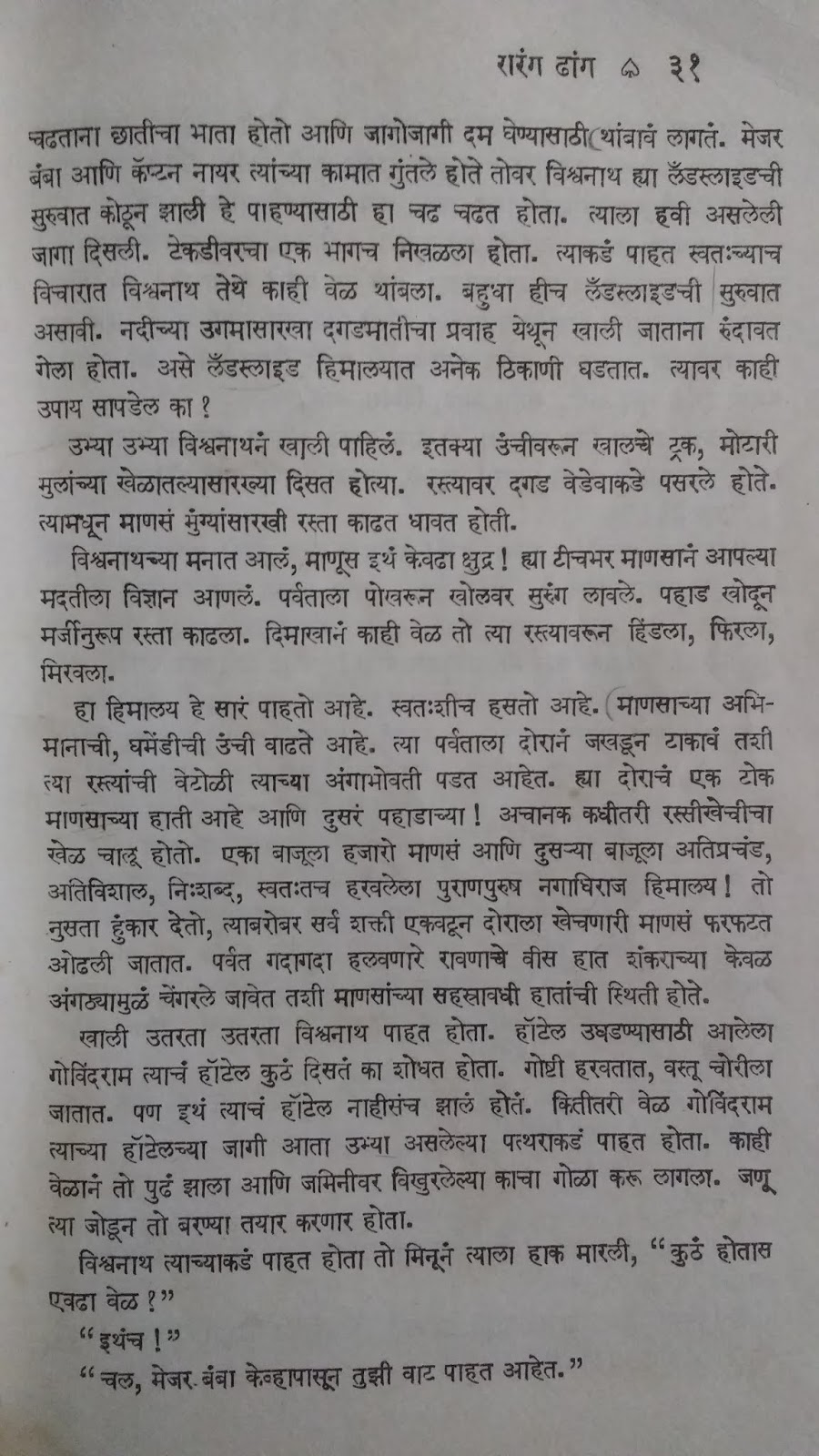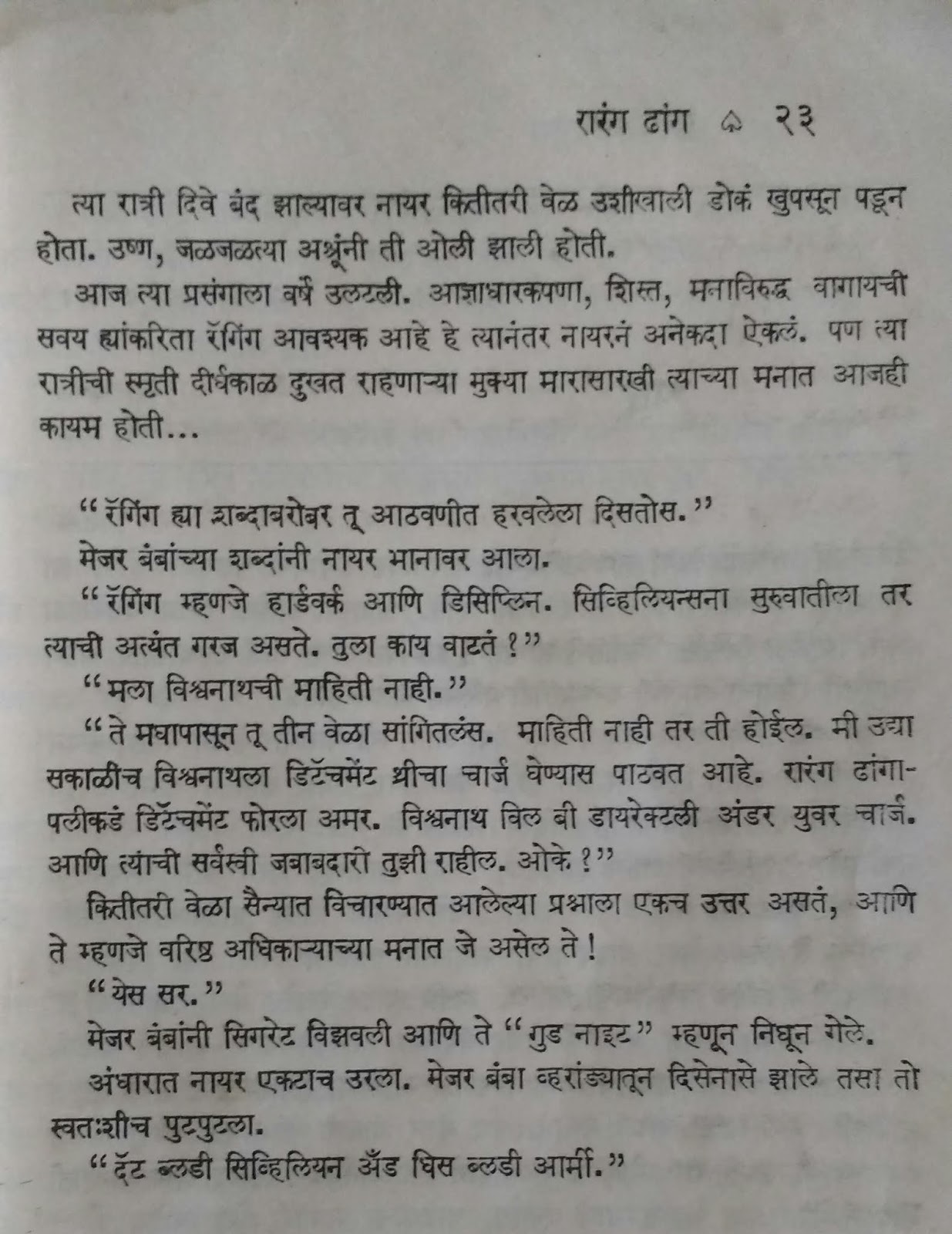 तसं म्हटलं तर “रारंग ढांग” ही एका रस्तेबांधणीची गोष्ट आहे. पण ती साधी नाही. एखाद्या ठिकाणी रस्ता बांधला जाणं म्हणजे त्या भागात पोचणं आता सोपं करणं. निर्मितीचा आनंद त्यात आहे. हे काम दुर्गम पर्वतीय भागात होत आहे म्हणून त्याला निसर्गागशी घेतलेल्या झुंजीची, माणसाच्या महत्वाकांक्षेची जोड आहे. हा पर्वत हिमालय असल्याने त्या कामाला भव्यतेची पार्श्वभूमी आहे. आणि हे काम लष्कर करतंय म्हणून त्याला सैनिकी शिस्तीचा आयाम आहे. लष्करातला अधिकारी ध्येयवादाने प्रेरित होऊन हे काम करत असल्याने या भौतिक कामाला एका तत्वचितंनाची जोड मिळाली आहे. हे सर्व स्वयंसिद्ध पैलू लेखनशैलीच्या कोंदणात सुरेख बसले आहेत. व्यक्ती, प्रसंग डोळ्यासमोर उभी करणारी वर्णन शैली, परिणामकारक संवाद, न रेंगाळणारे प्रसंग, कुठल्याही पात्रावर अन्याय न करणारं समतोल चित्रण याची सुरेख मेजवानी असं हे पुस्तक आहे.