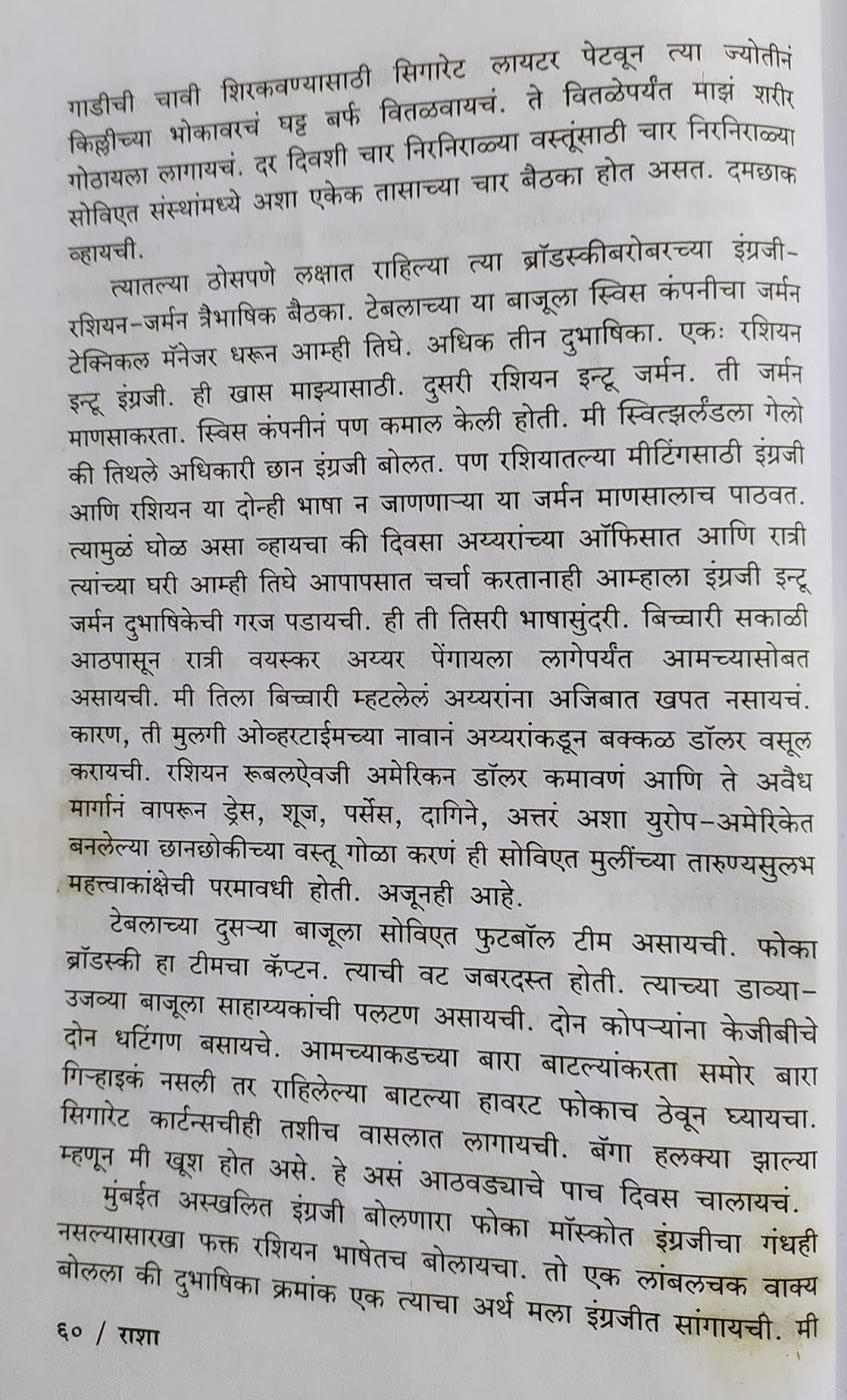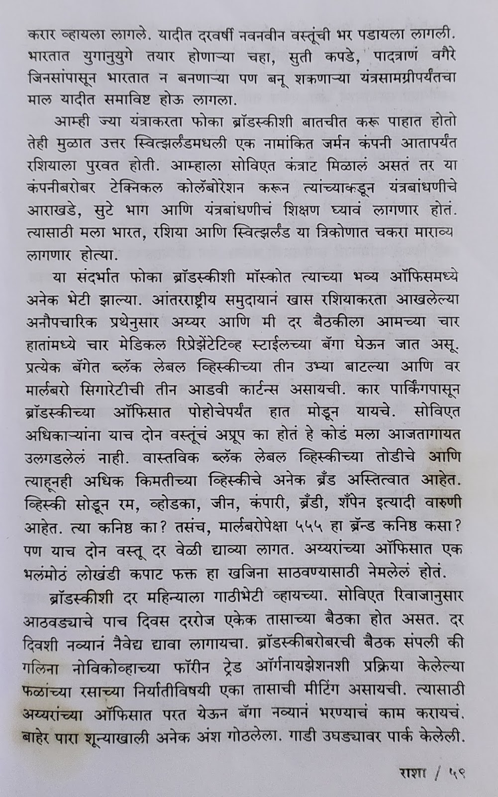 रशियामध्ये कम्युनिझम किंवा साम्यवाद असल्यामुळे सर्वांना एकच पगार, सगळ्यांनी एकाच सरकारी दुकानातून एकाच पद्धतीच्या वस्तू विकत घ्यायच्या असा प्रकार त्यामुळे परदेशी मालाबद्दल प्रचंड आकर्षण तयार झालं होतं. मग एखादा परदेशी पाहुणा आपल्याकडे कॉन्टॅक्ट मिळवायला आला की हे सरकारी बाबू दारूसाठी, परदेशी वस्तूंसाठी अगदी चटावलेले असायचे. कंपनीच्या लोकांनी अशा स्वरूपात लाच देणे हे गृहीतच होतं. कोणी नाही दिली तर ते सरळ स्पष्टपणे मागत सुद्धा होते. अशा वस्तू मिळत राहाव्या म्हणून वेळकाढूपणा करत मीटिंग लांबविण्याचे प्रकार व्हायचे तशातला हा एक प्रसंग