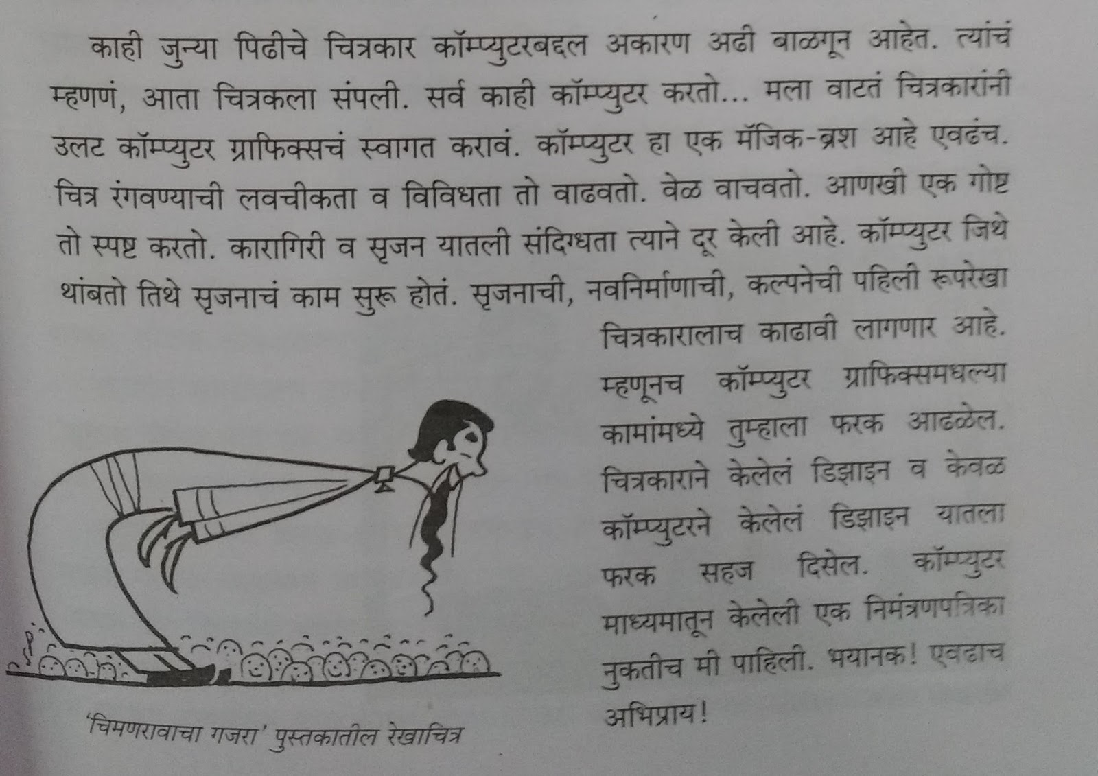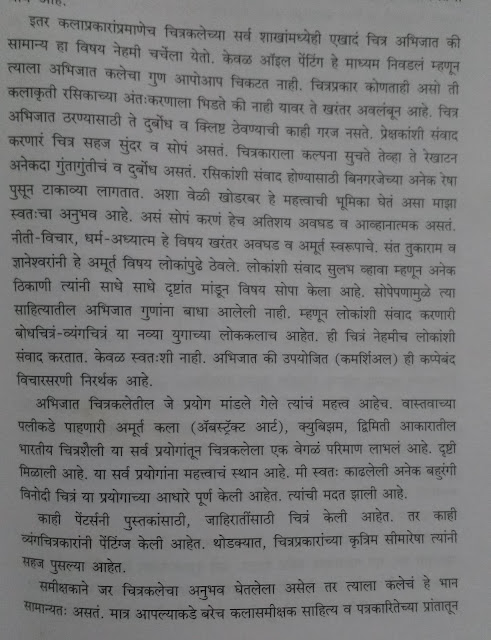 पुस्तकात नवे-जुने फोटो आणि व्यंगचित्रं भरपूर आहेत. काही चित्रांच्या जन्मकथा सांगितल्या आहेत. डायरी सदृश प्रकरणे सोडली तर सगळं पुस्तक रोचक, माहितीपर आहे. माझ्या सारखे जे चित्रकला प्रांतात प्रत्यक्ष/अप्रत्यक्ष काम करत नाहीत त्यांना हा व्यवसाय कसा चालतो याची एक झलक पहायला मिळेल. चित्रकार कसा विचार करतो हे त्याच्याच शब्दात वाचायला मिळेल. पुस्तक म्हणजे त्यांची प्रदीर्घ मुलाखतच आहे. असं वाटतं की त्यांनी अजून एक पुस्तक लिहावं ज्यात खूप चित्र आणि प्रत्येक चित्राची जन्मकथा सांगावी. कार्ण पुस्तक वाचताना वाटायला लागलं कि “चित्रस्य कथा रम्या”.