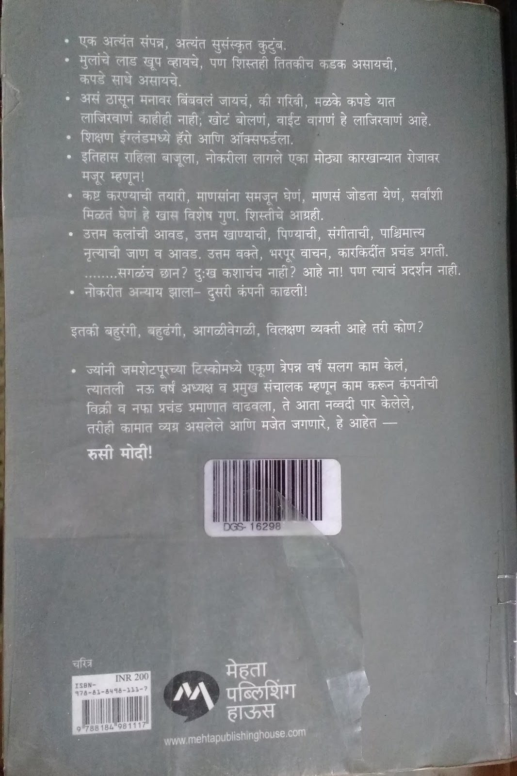 म्हणून मी पहिल्या परिच्छेदात लिहिलं तसं हे रुसी मोदी यांच्या विषयीचे हे पुस्तक आहे; चरित्र वाटत नाही – स्तुतिगाथा वाटते.