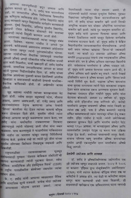 कोरोनाची लस, त्यावरची औषधे, औषधनिर्माण कंपन्या सुद्धा सतत चर्चेत आहेत. “सिप्ला” ही कंपनी मूळ भारतीय आहे हे माहित आहे का ? स्वातंत्र्यपूर्व काळातल्या “स्वदेशी”च्या वातावरणात के.ए.हमीद यांनी सिप्ला ची सुरुवात केली. हमीद आणि त्यांचे कर्तृत्त्ववान पुत्र यांच्या कामाची थोडक्यात ओळख सचिन इटकर यांनी करून दिली आहे. त्यातली दोन पाने नमुन्यादाखल