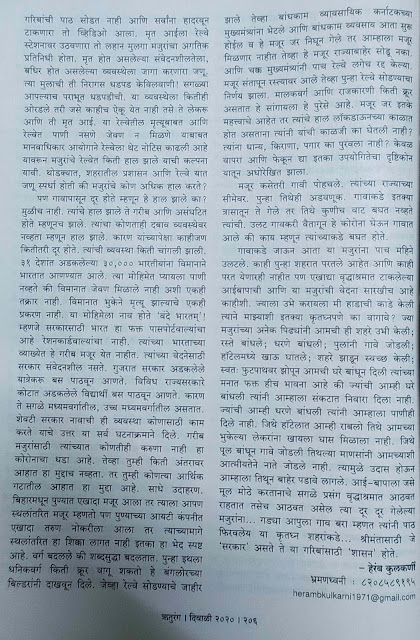 गांधीजी आज असते तर कोरोना महामाररीला कसे सामोरे गेले असते हा अभय बंगांचा लेख बोधप्रद आहे. स्थलान्तरित मजुरांची झालेली फरपट तीव्र शब्दांत मांडणाऱ्या हेरंब कुलकर्णी यांच्या लेखातील एक पान