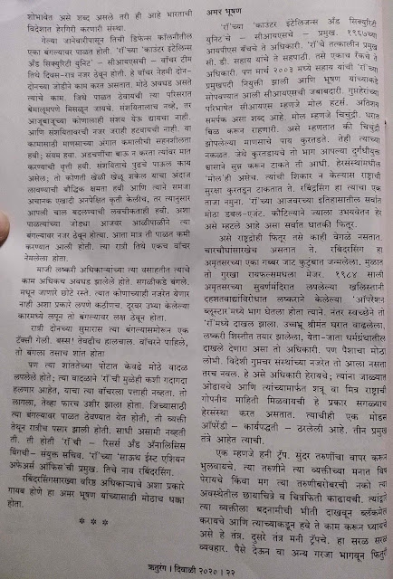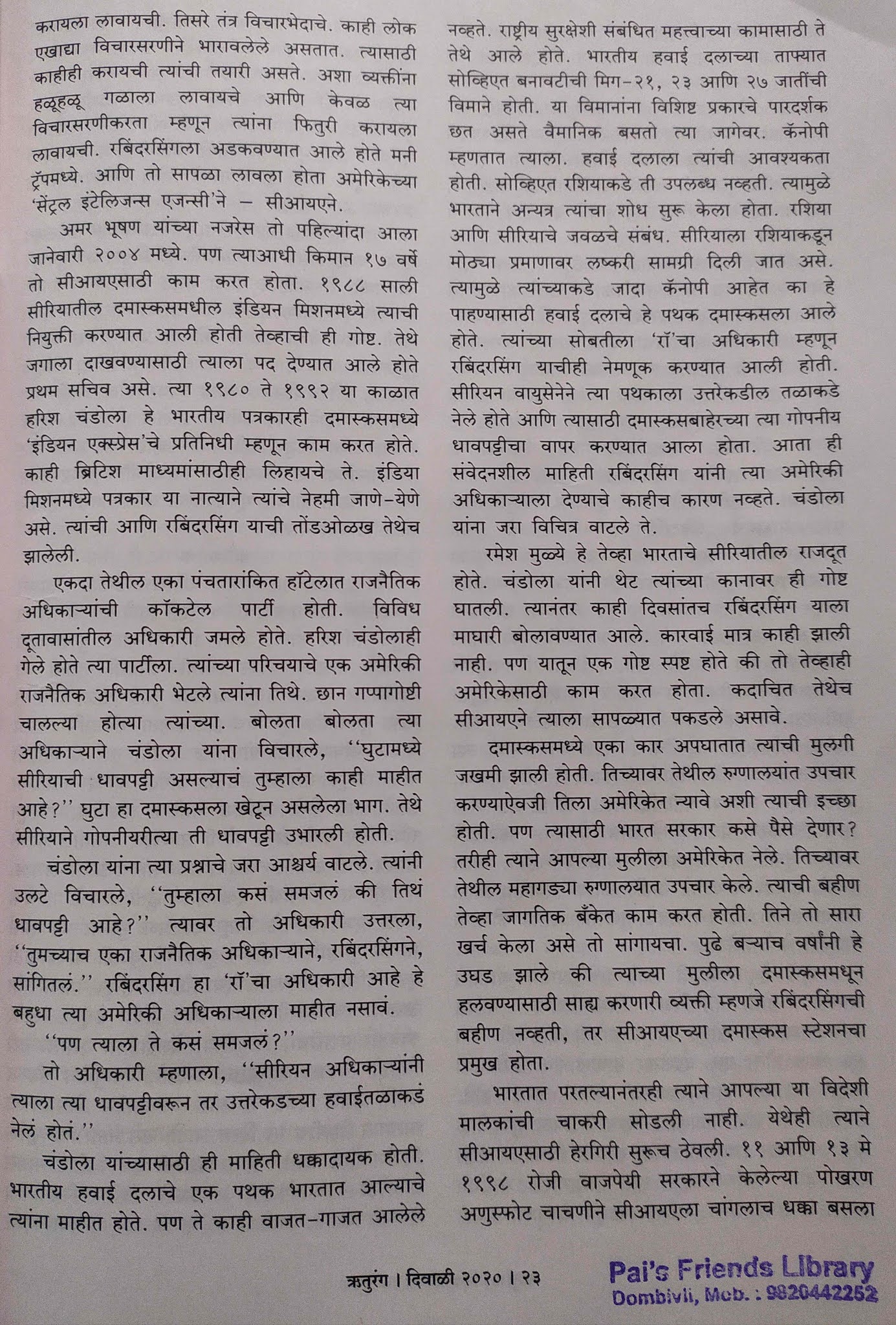 “मोल हंटर आणि सुटलेली शिकार”हा लेख वेगळीच लढत दाखवतो. भारताची गुप्तहेर संघटना – “रॉ” मधला एक उच्चपदस्थच फितूर झाला होता. त्याची फितुरी शोधून काढण्याच्या धडपडीवर आधारित हा लेख आहे. त्यातला एक भाग