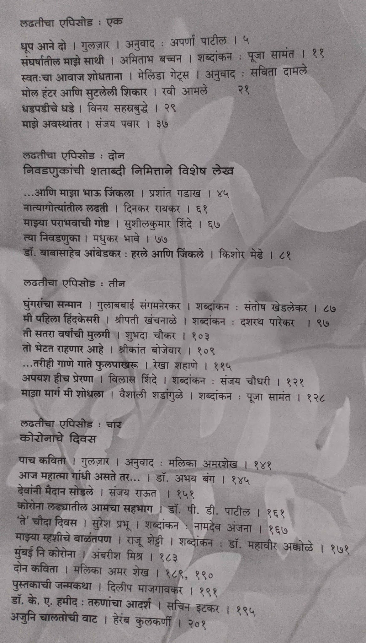 “लढतीचा एपिसोड ३” आणि “”लढतीचा एपिसोड १” मध्ये दीर्घ लेख आहेत. लावणी, कुस्ती, पर्यावरण, उद्योग, स्वयंरोजगार अश्या क्षेत्रातल्या व्यक्तींनी स्वतः किंवा त्यांच्याबद्दल लेखकाने लिहिले आहे. आणि आपल्या जीवनाचा पट मांडला आहे.