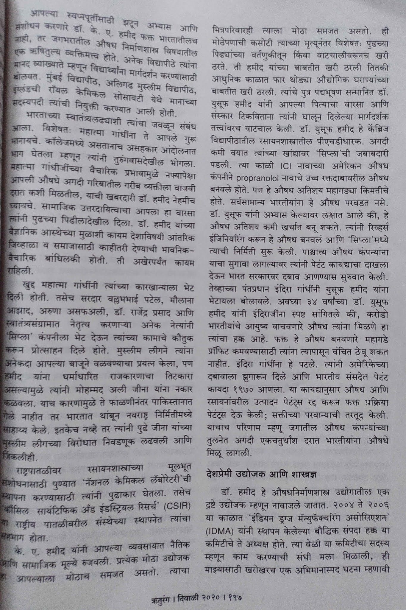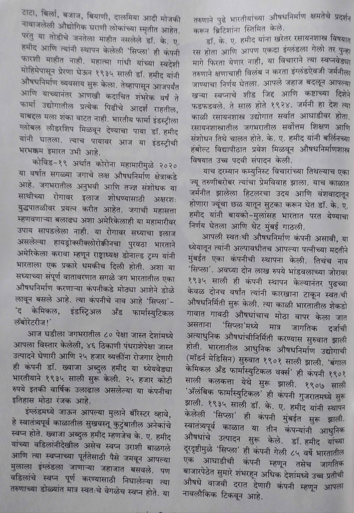 कोरोनाची लस, त्यावरची औषधे, औषधनिर्माण कंपन्या सुद्धा सतत चर्चेत आहेत. “सिप्ला” ही कंपनी मूळ भारतीय आहे हे माहित आहे का ? स्वातंत्र्यपूर्व काळातल्या “स्वदेशी”च्या वातावरणात के.ए.हमीद यांनी सिप्ला ची सुरुवात केली. हमीद आणि त्यांचे कर्तृत्त्ववान पुत्र यांच्या कामाची थोडक्यात ओळख सचिन इटकर यांनी करून दिली आहे. त्यातली दोन पाने नमुन्यादाखल