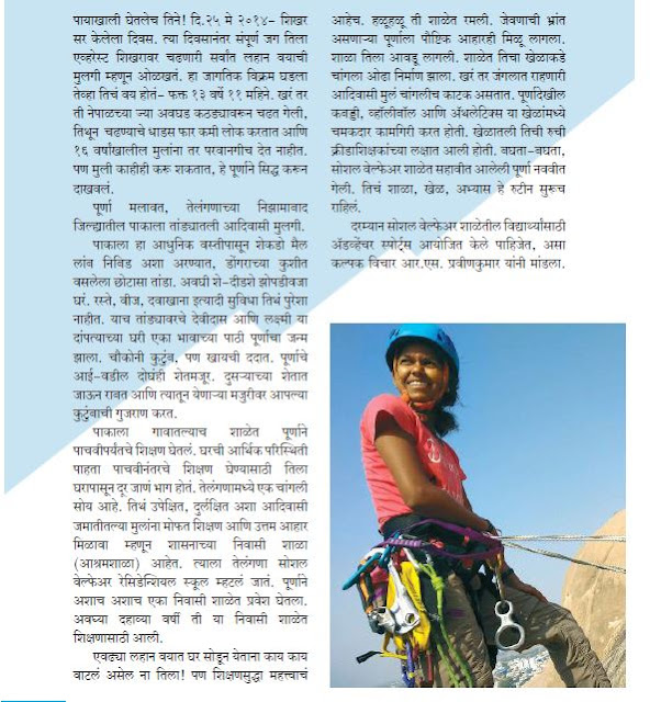 तांड्यातून एव्हरेस्टवर – पूर्णा मलावत (तेलंगणा) एका आदीवासी पाड्यातली मुलगी जेमतेम १४ वर्षांची असताना एव्हरेस्ट चढली