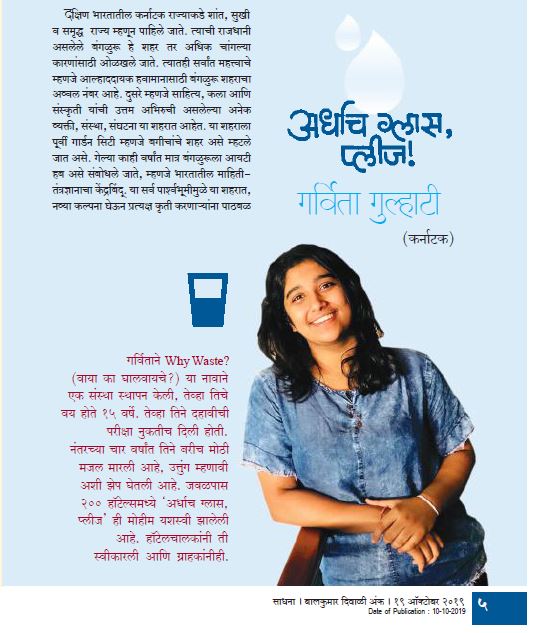 “अर्धाच ग्लास प्लीज” – गर्विता गुल्हाटी (कर्नाटक) या पंधरा वर्षाच्या मुलीने पाणी वाचवण्यासाठी संस्था सुरी केली , हॉटेल मध्ये होणारी पाण्याची नासाडी थांबवण्यासाठी कृती सुरू केली.