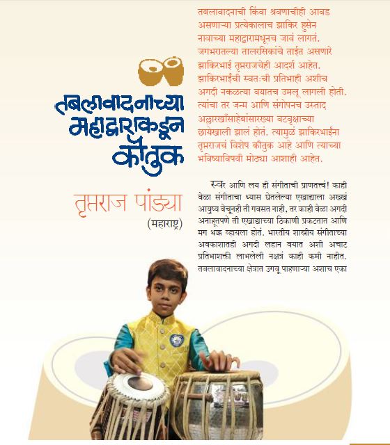 तबलावादनाच्या महाद्वाराकडून कौतुक – तृप्तराज पंड्या (महाराष्ट्र). गेली सहा वर्षे सर्वांत लहान वयाच्या तबलावादकाचे गिनीज बुक रेकॉर्ड तृप्तराजच्या नावावर आहे.