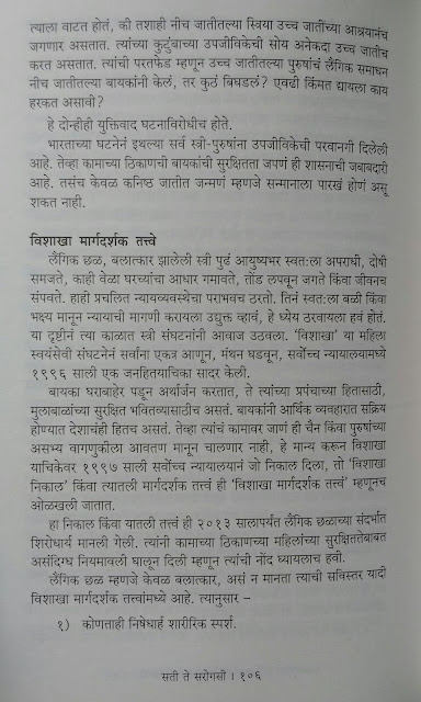 या पुस्तकात कायद्यांची चर्चा करताना त्यातल्या महत्त्वाच्या मुद्द्यांचीही सविस्तर माहिती दिली आहे. उदा. विशाखा कायद्यातील महत्त्वाच्या तरतुदी