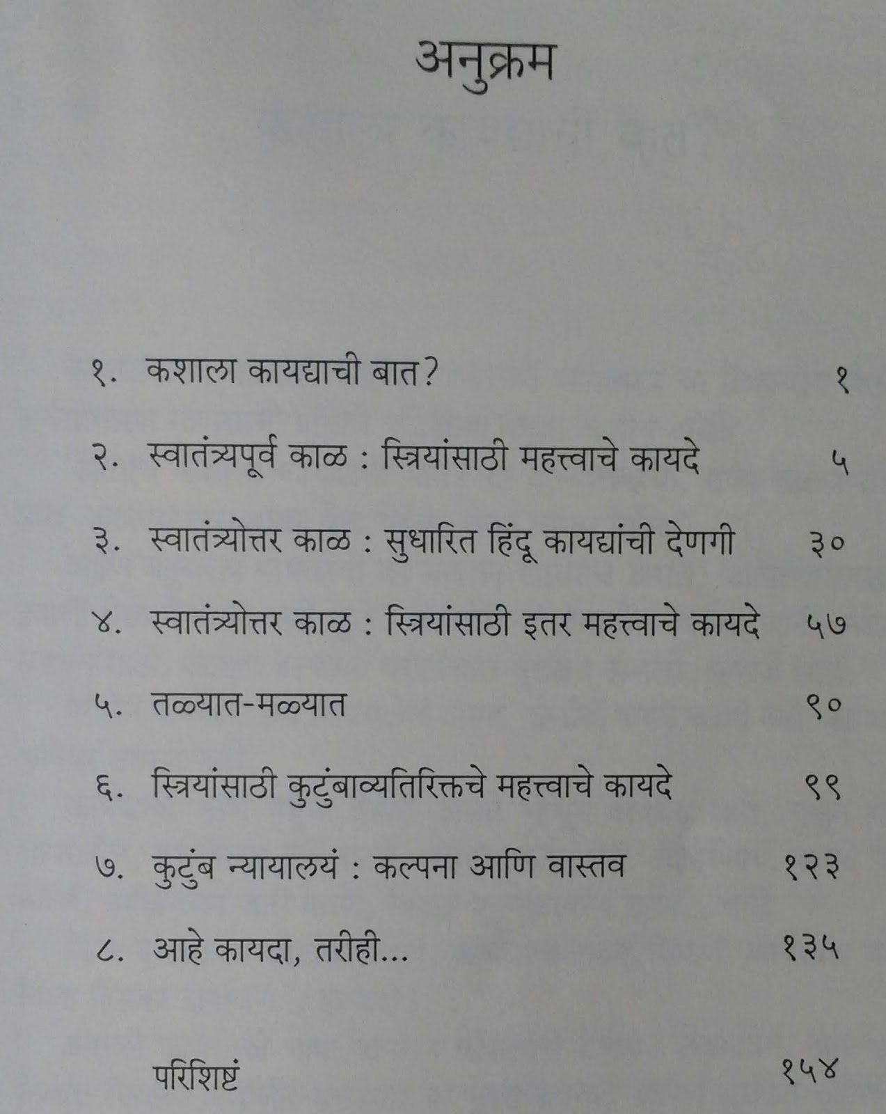 पुस्तकाच्या मुखपृष्ठावर म्हटल्याप्रमाणे भारतातल्या महिला कायद्यात होत गेलेले बदल, सुधारणा यांचा मागोवा घेणारे हे पुस्तक आहे. ब्रिटिश राजवटीत सतीबंदीचा कायदा करण्यात आला तिथपासून २०१७ सालच्या अखेरीपर्यंतचा कालखंड यात समाविष्ट आहे. सतीबंदी, विधवापुनर्विवाहाला मान्यता, संमतीवयाचा कायदा, हिंदू विवाह कायदा, घटस्फोट आणि पोटगी, महिला आरक्षण, महिला अत्याचार प्रतिबंध अशा बऱ्याच कायद्यांचा आणि घडामोडींचा समावेश यात आहे.