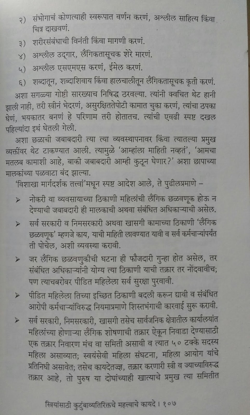 या पुस्तकात कायद्यांची चर्चा करताना त्यातल्या महत्त्वाच्या मुद्द्यांचीही सविस्तर माहिती दिली आहे. उदा. विशाखा कायद्यातील महत्त्वाच्या तरतुदी