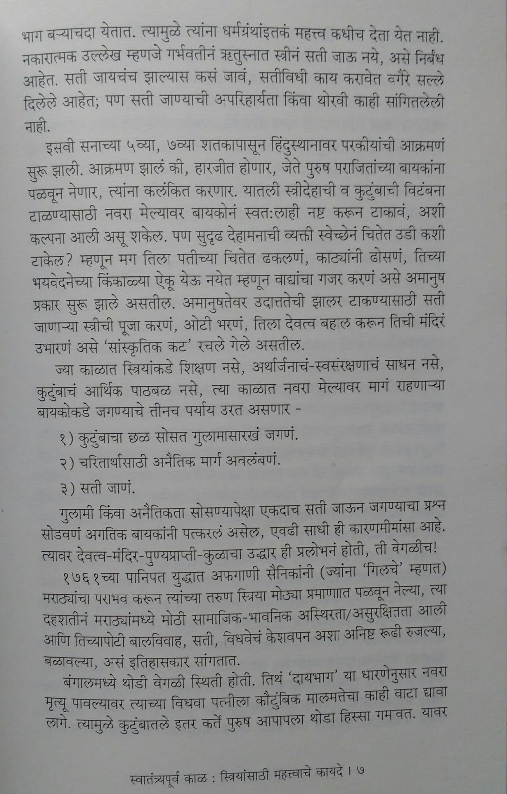 कायदा करावा लागला तेव्हा सामाजिक परिस्थिती काय होती, कायद्याच्या मागण्या कशा पुढे येत होत्या, एखादी विशिष्ट घटनेमुळे कायदा करणं कसं भाग पडलं, साधारण कायद्याचे स्वरूप काय आहे अशी माहिती पुस्तकात आहे. उदा. सतीबंदी कायदा करावा लागला तेव्हा सतीची प्रथा का पुढे आली आणि कश्या पद्धतीने अंमलात येत होती त्याबद्दल.