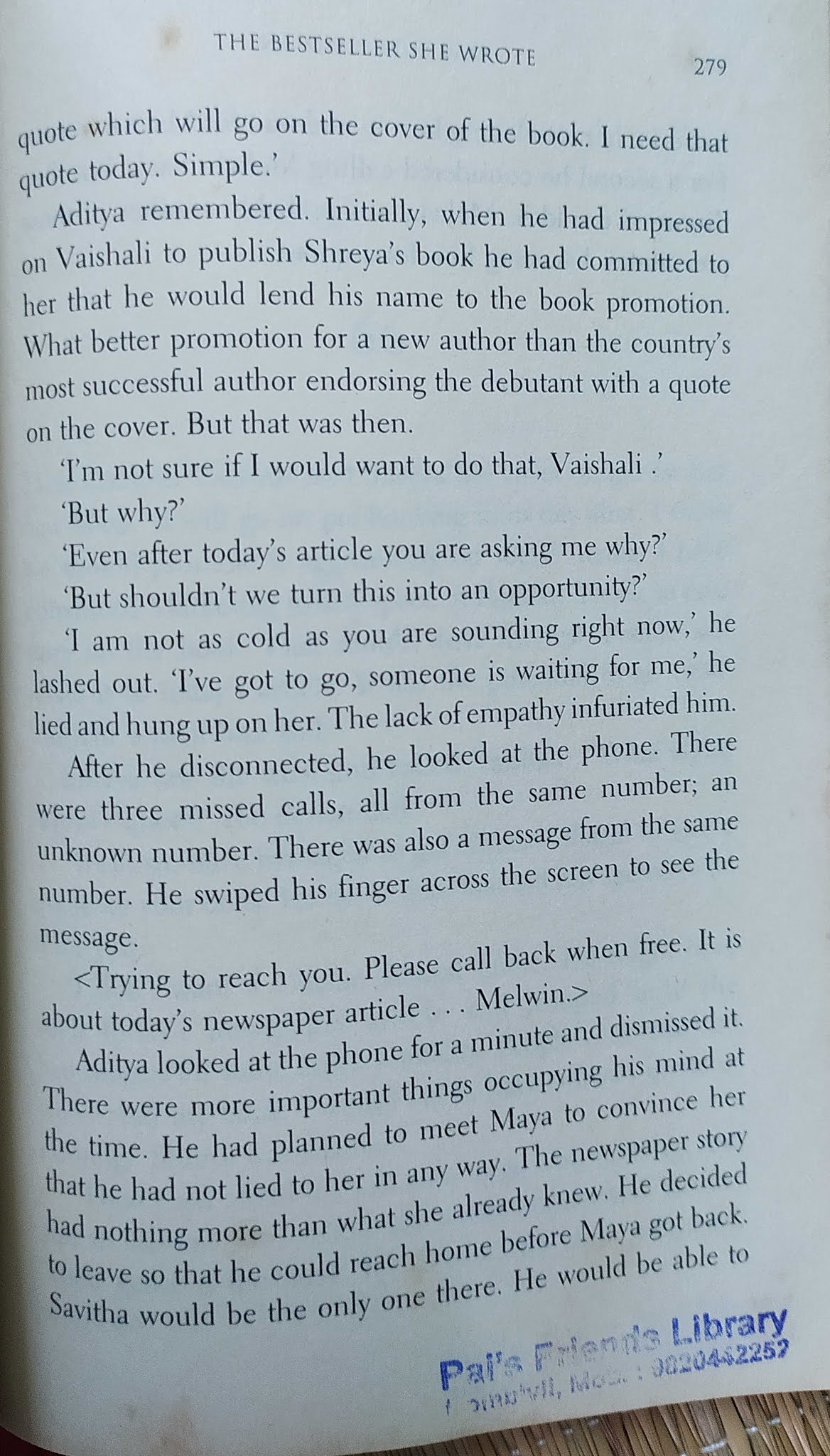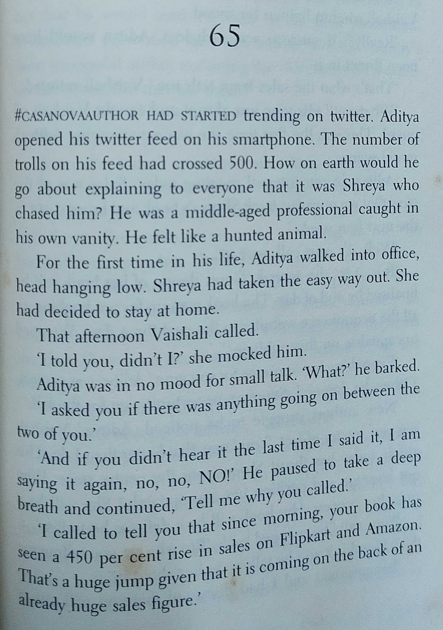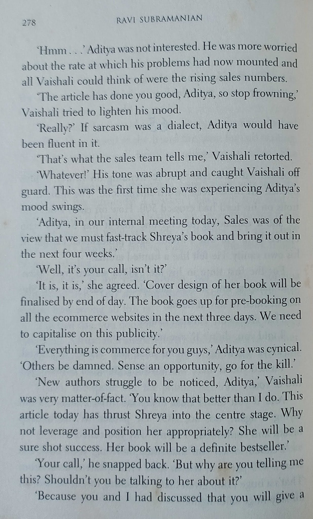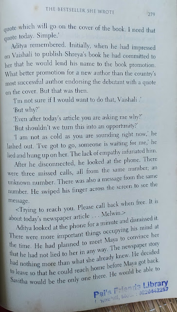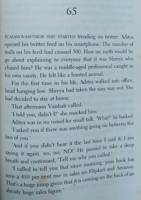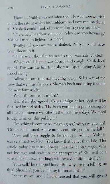 मुख्य पात्र लेखक असल्यामुळे लेखन-प्रकाशन व्यवसायातील व्यावसायिक गणितं आणि “आतल्या गोष्टीं”बद्दल ओघात काही लिहिलं गेलं आहे. असाच एक प्रसंग.