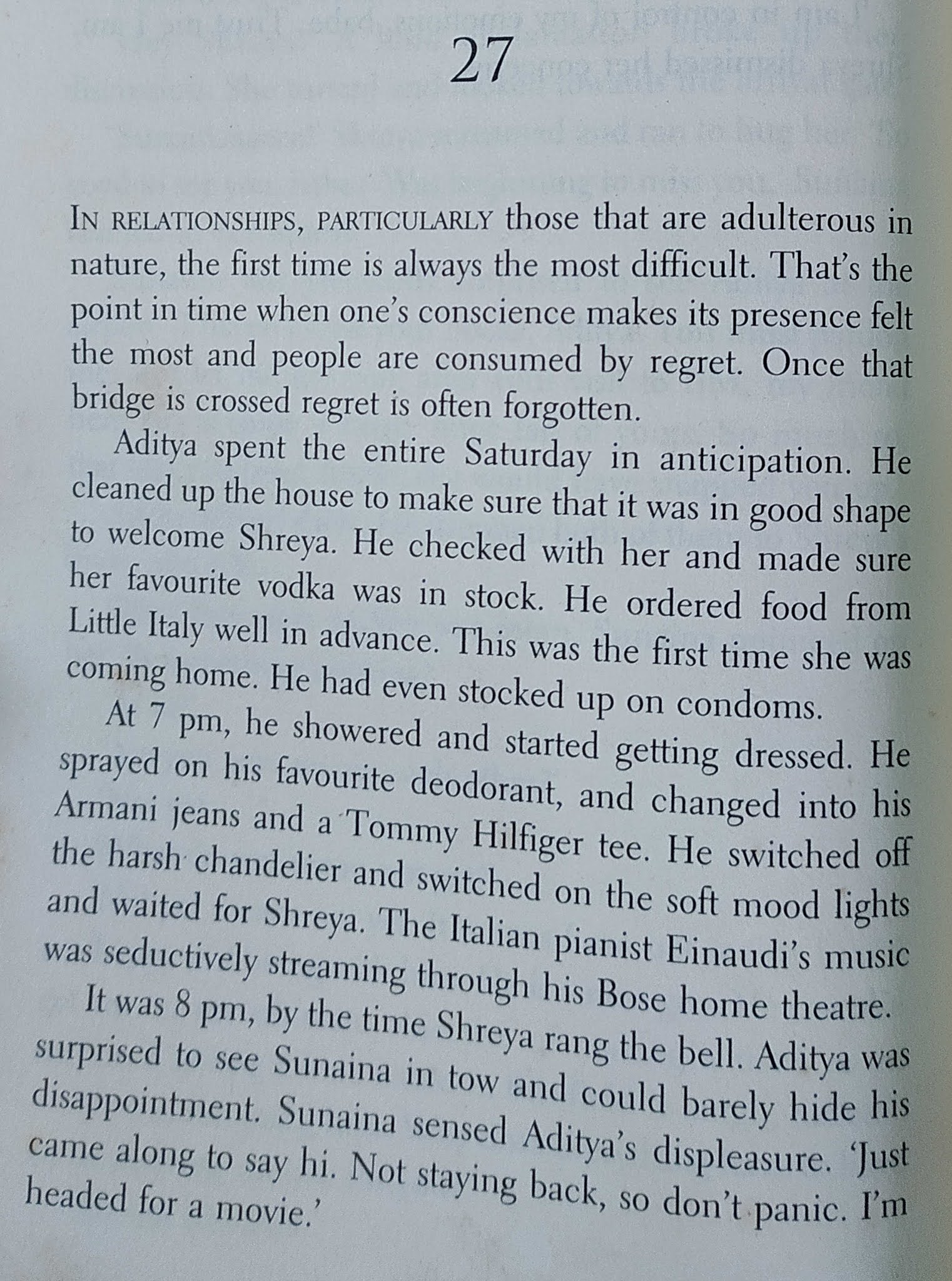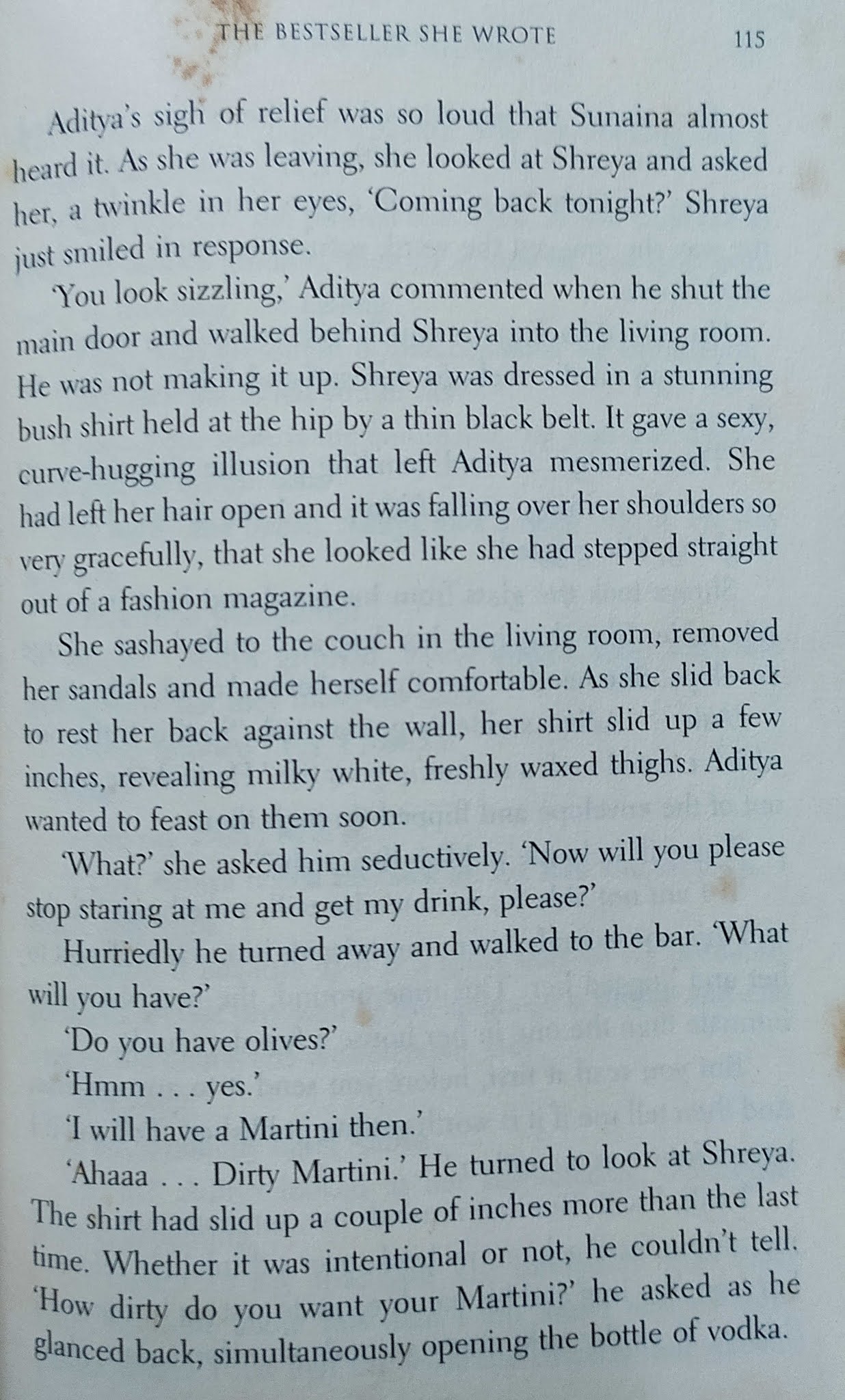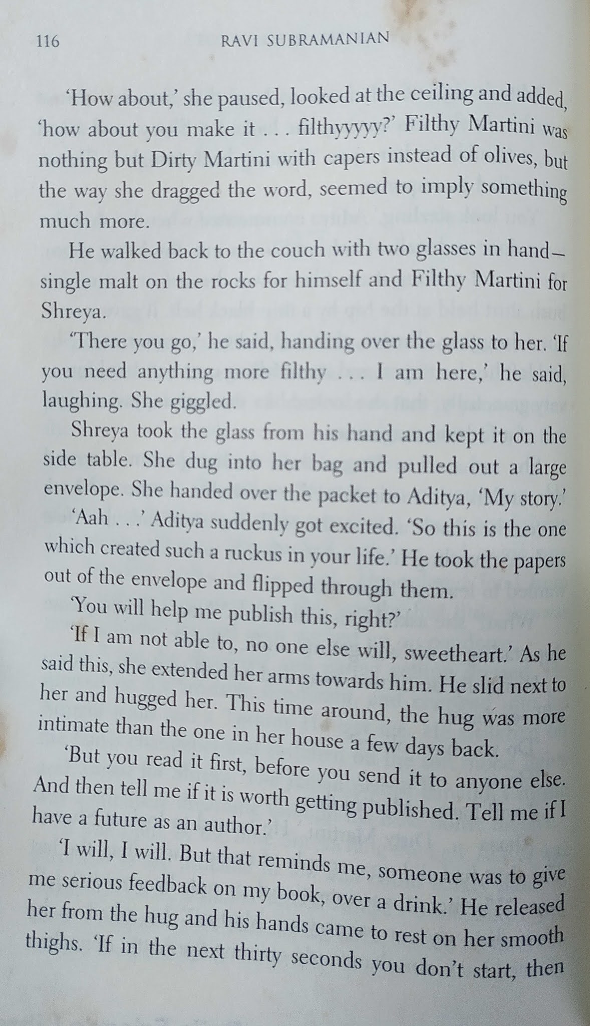 मुख्य पात्र लेखक असल्यामुळे लेखन-प्रकाशन व्यवसायातील व्यावसायिक गणितं आणि “आतल्या गोष्टीं”बद्दल ओघात काही लिहिलं गेलं आहे. असाच एक प्रसंग.