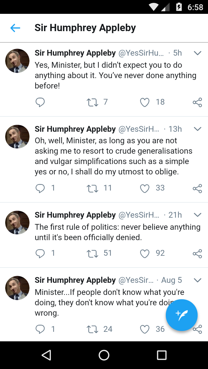 सचिव: तुम्ही फक्त फायली “इन” ट्रे मधून “आउट” ट्रे मध्ये ठेवा. आणि कोणी विचारलं तर तुमच्या वतीने आम्ही उत्तर देऊ “Matter is under consideration” कोणी फारच जास्त चौकशी केली तर उत्तर देऊ, “Matter is under active consideration”.
