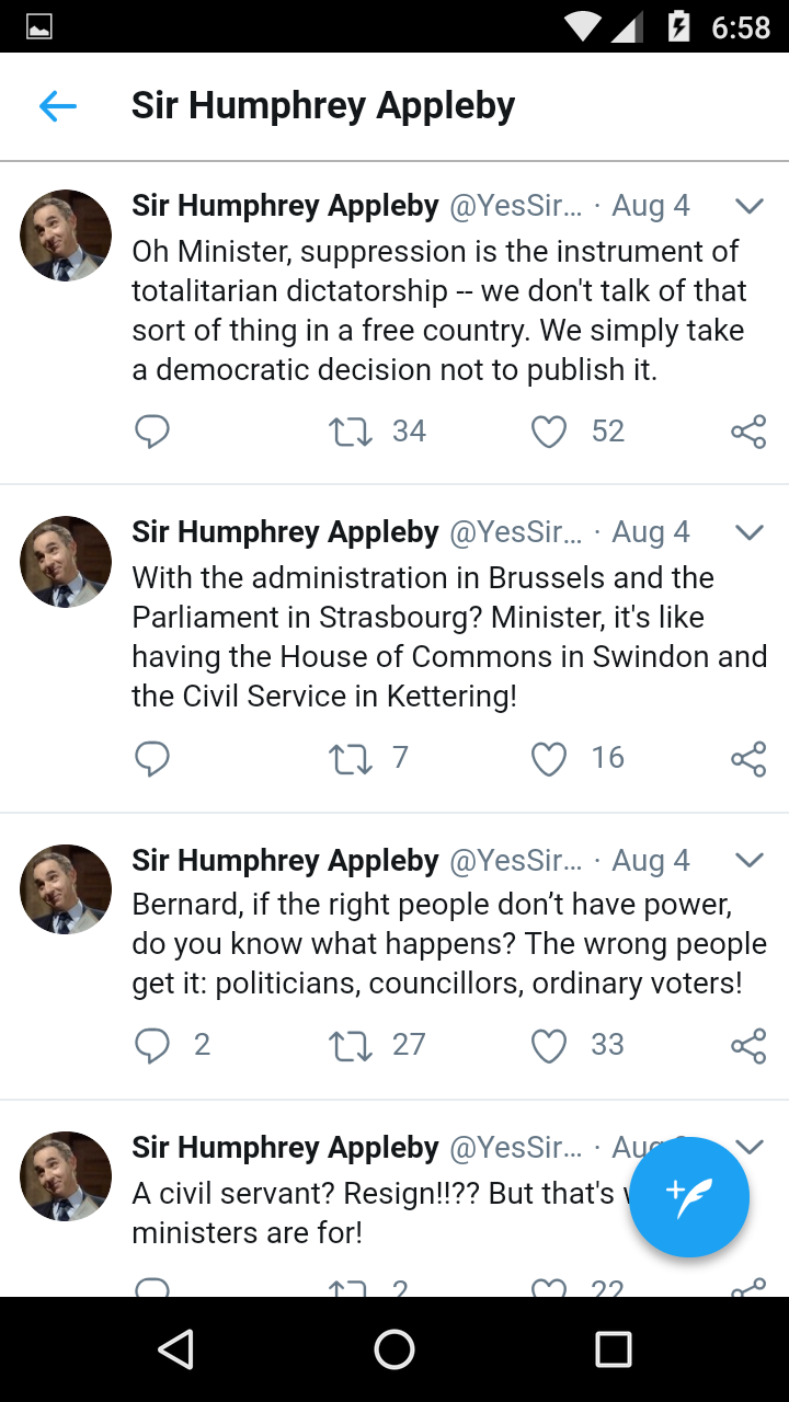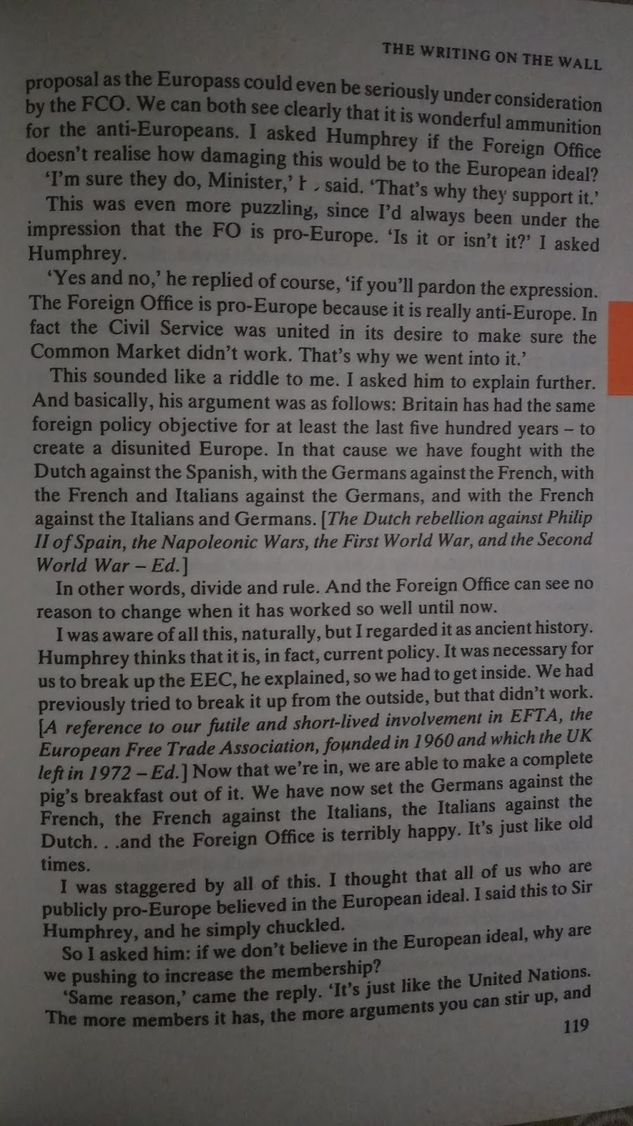 युरोपियन युनिअन मध्ये ब्रिटन स्वतःच्या स्वार्थासाठी घुसले आहे, युरोपियन देशांत एकवाक्यता नसावी यातच आपलं हीत कसं आहे हे हंफ्री मंत्र्याला पटवून सांगतो. ब्रेक्झिट ची बीजे इथे आपल्याला दिसतात.