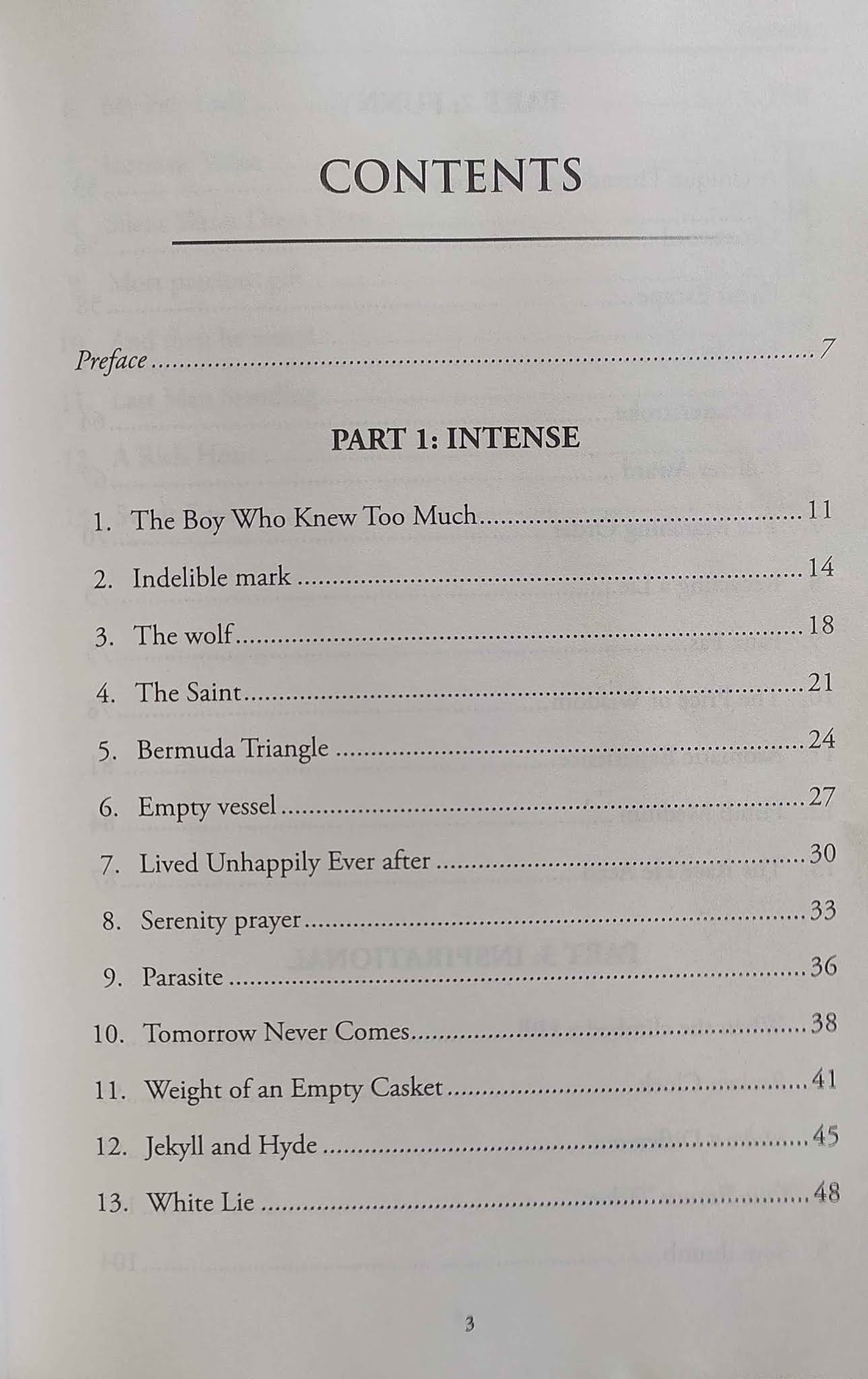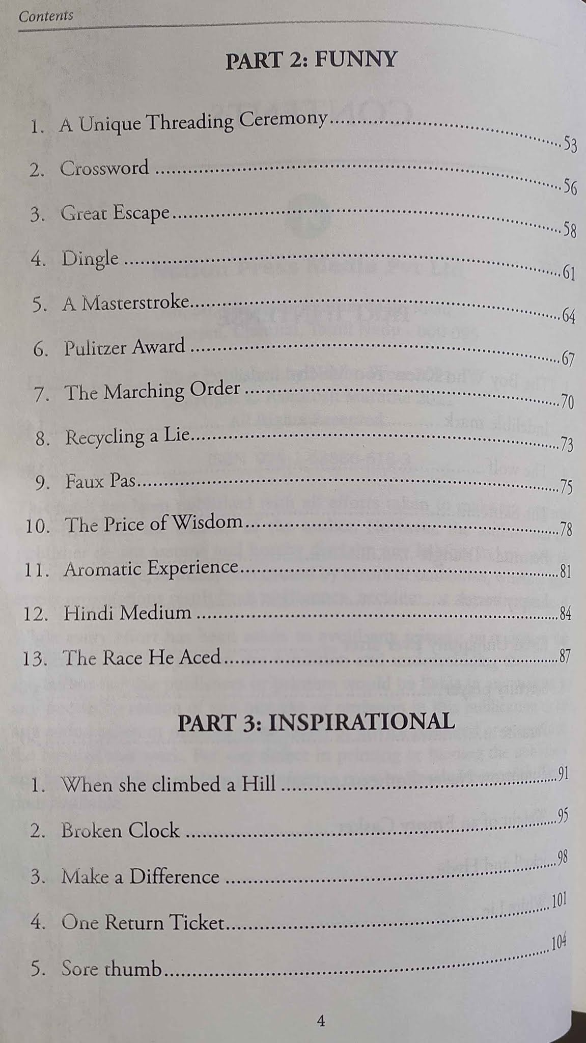 “Funny” गटात नावाप्रमाणेच थोडे मजेशीर, हलकेफुलके प्रसंग आहेत. लहानपणी मित्रांबरोबर रेल्वे प्रवासात टॉयलेट मध्ये काढलेली रात्र, हिंदी न येणाऱ्या आजीबाईचा मराठी न येणाऱ्या भैय्याशी मुंबैय्या हिंदीतला संवाद, परदेशात भारतीय खाण्याच्या घमघमाटामुळे पाकिस्तानी माणसातला “देसी” जागा होतो इ.
