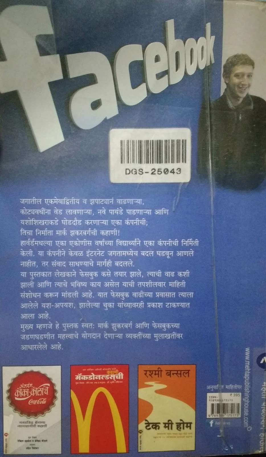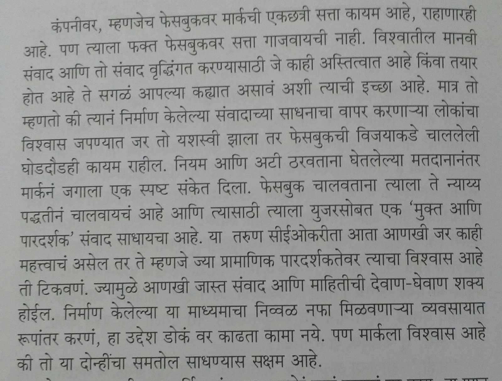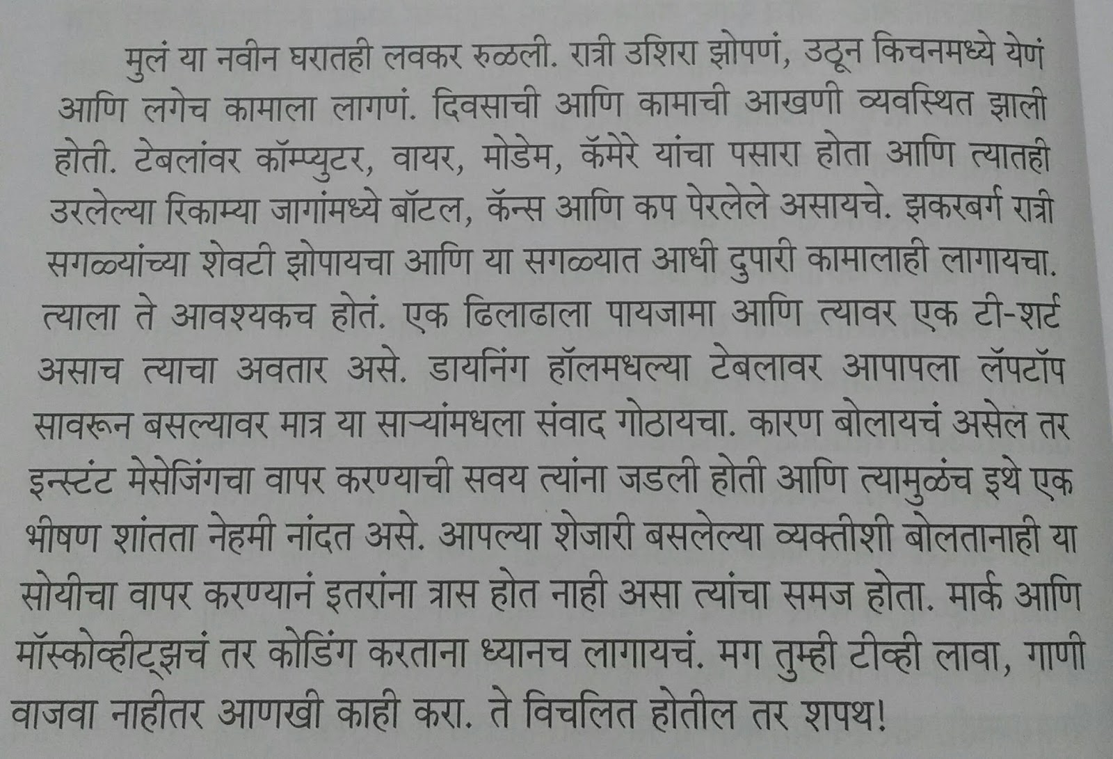 पुस्तकात एकही फोटो नाही हे पण खटकलं. फेसबुकच्या जुन्या ऑफिसचे, मार्कच्या कुटुंबाचे, सुरुवातीच्या सहकाऱ्यांचे, जुने फेसबुक प्रोफाईल कसे दिसायचे याचे, एखाद दुसऱ्या सामाजिक चळवळीचे फोटो आवश्यक होते.