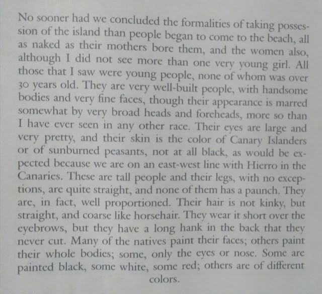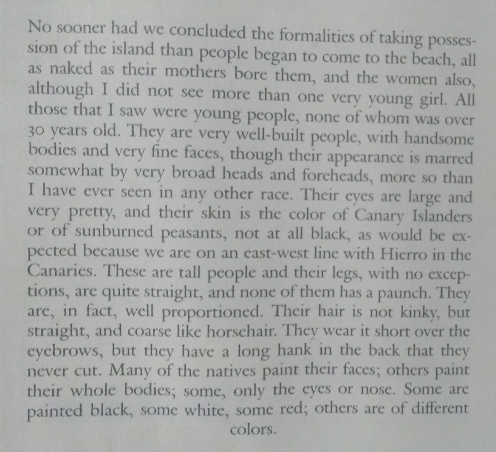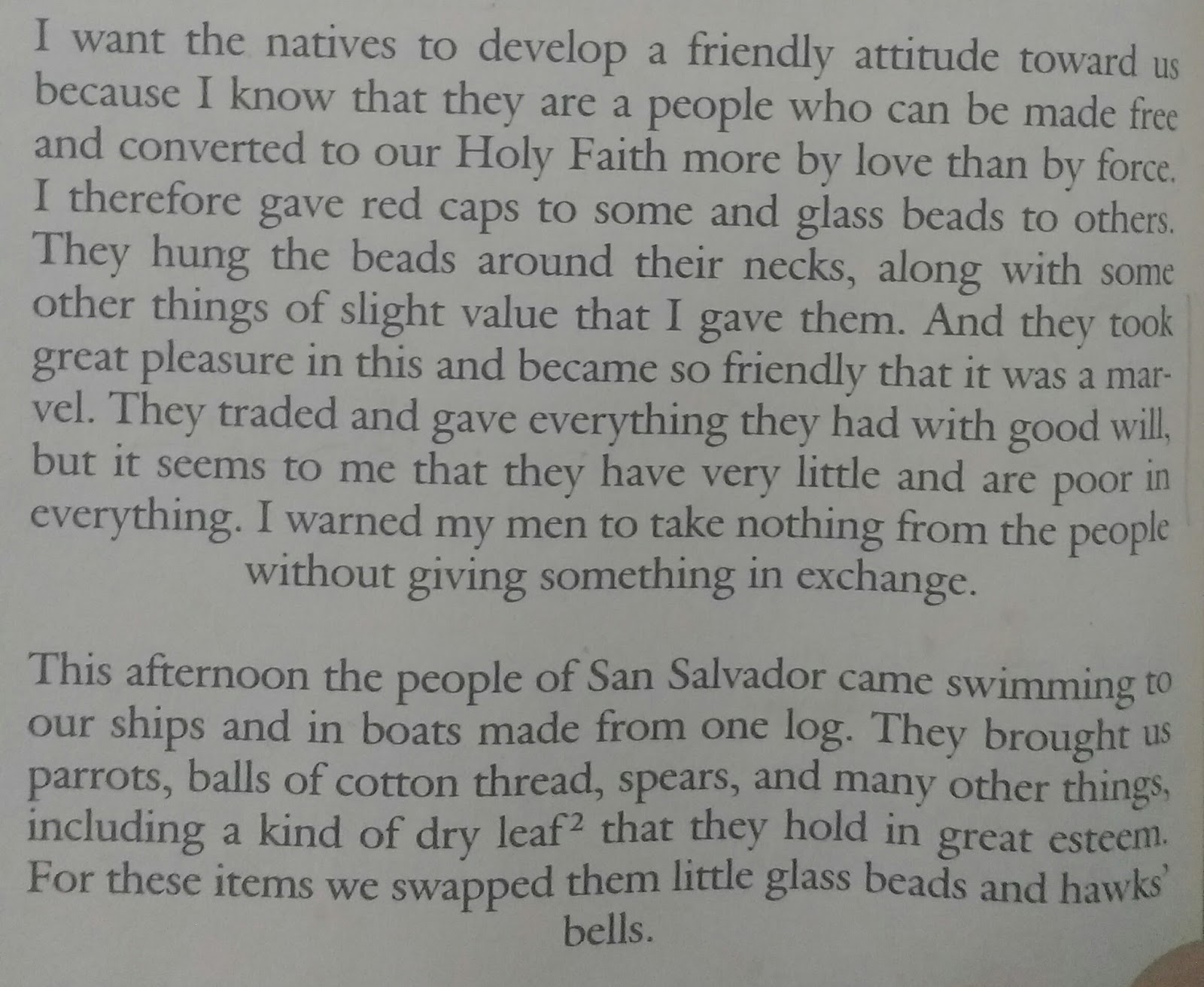 तिथल्या आदिवासी – “इंडियन” लोकांनी हे जहाज, गोरे लोक बघून हे लोक जणू स्वर्गातूनच आले आहेत अशा भावनेने, भीती आणि आदराने त्यांनी यांचं स्वागत केलं. खाणाखुणांच्या भाषेने एकमेकांचं बोलणं कसंबसं समजून घेतलं. कोलंबसाने त्यांचं वर्णन कसं केलंय पहा.