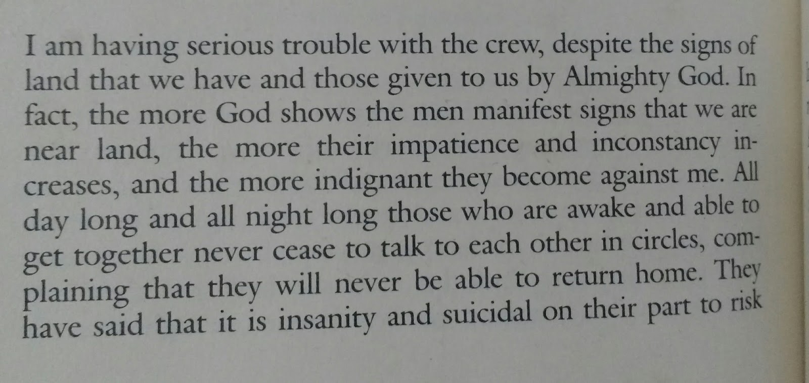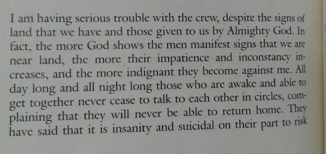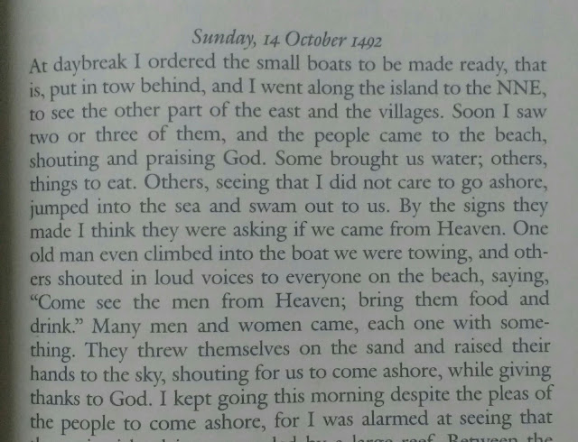 ३ ऑगस्ट १४९२ ला कोलंबस स्पेनमधून निघाला. दोन महिन्यांनी तो नव्या भूमीत पोचला. ऑक्टोबर ते जानेवारी तो नवीन प्रदेश, नवीन बेटं बघत तिथल्या आदिवासींशी भेटत राहिला. जानेवारीत परतीचा प्रवास सुरू करून मार्च १४९३ ला तो स्पेनला परत आला. भारताचा नवा मार्ग सापडल्याची बातमी घेऊन. या सर्व प्रवासात त्याने रोजच्या रोज डायरी लिहून या प्रवासाचा अहवाल स्पेनच्या राजाला सादर केला. मूळ स्पॅनिश मधल्या या डायरीचं हे इंग्रजी भाषांतर आहे. रोज किती प्रवास केला, समुद्रात नवीन काय दिसलं, बोटीवर काय घडलं हे कोलंबस सांगतो आणि आपणही त्याच्या बरोबर हा प्रवास करायला लागतो. कित्येक दिवस झाले तरी जमीन काही दिसत नाही यामुळे वैतागलेले आणि जिवंत काही परत जात नाही असं वाटून निराश झालेले नाविक आणि बाकी कर्मचारी यांना कोलंबसाने धीर कसा दिला हेही वाचायला मिळतं. आपण घरापासून खूप दूर आलोय असं वाटू नये म्हणून बोटीने कापलेल्या अंतरांची नोंद चक्क खोटी, कमी अंतर दाखवण्याची शक्कलही त्याला लढवायला लागली. त्याच्याच शब्दांत वाचा :