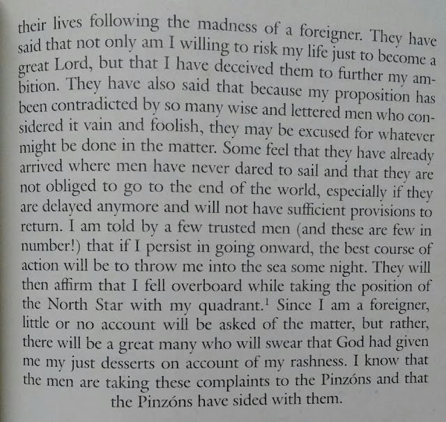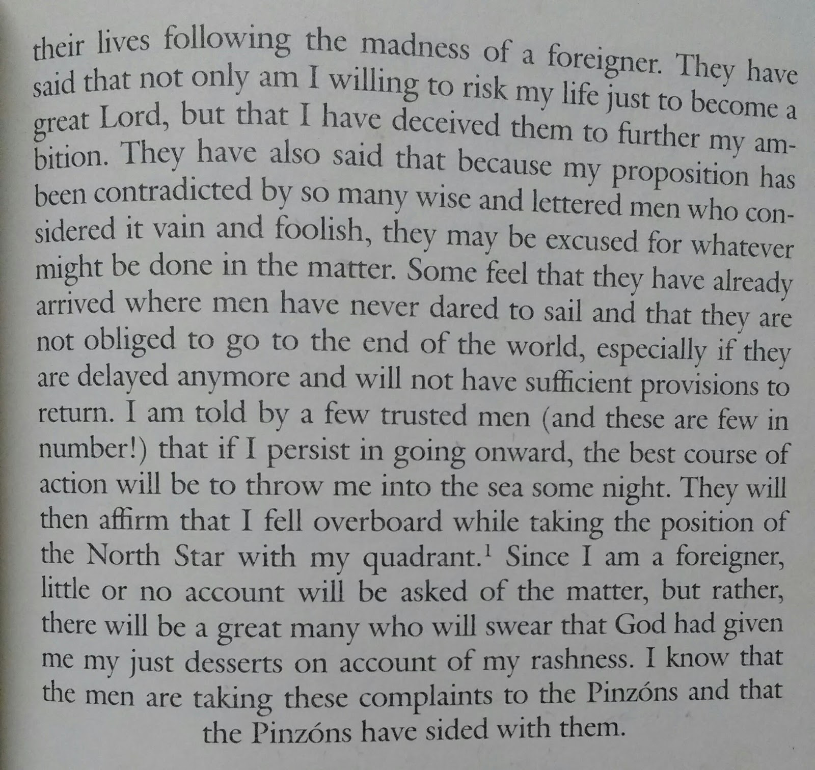 युरोपाच्या पूर्वेला भारत आहे. युरोपातून पूर्वेच्या ऐवजी पश्चिमेकडून गेलं तर पृथ्वी गोल असल्याने भारतात पोचता येईल. या तर्कातून कोलंबसाने साहसी प्रवासाला सुरुवात केली. भारताच्या ऐवजी तो पोचला एका नव्या भूप्रदेशात. आणि कोलंबसाला अमेरिकेचा शोध लागला. इतपतच माहिती आणि कोलंबसाचे गर्वगीत ही कविता एवढंच साहित्य आत्तापर्यंत कोलंबसाबद्दल वाचलं होतं. सुमारे पाचशे वर्षांपूर्वी शिडाच्या जहाजातून अज्ञात प्रवासाला निघणारा कोलंबस आणि त्याचे साथी, त्यांच्या प्रवासातला थरार, नव्या भूप्रदेशाशी तिथल्या आदिवासींशी (शब्दशः) आलेला संपर्क हे सगळं थेट कोलंबसच्या शब्दात जाणून घ्यायची संधी या पुस्तकाने दिली. वाचनालयात एका कोपऱ्यात धूळ खात पडलेलं हे पुस्तक खूप मोठा ऐतिहासिक दस्तऐवजआहे.
