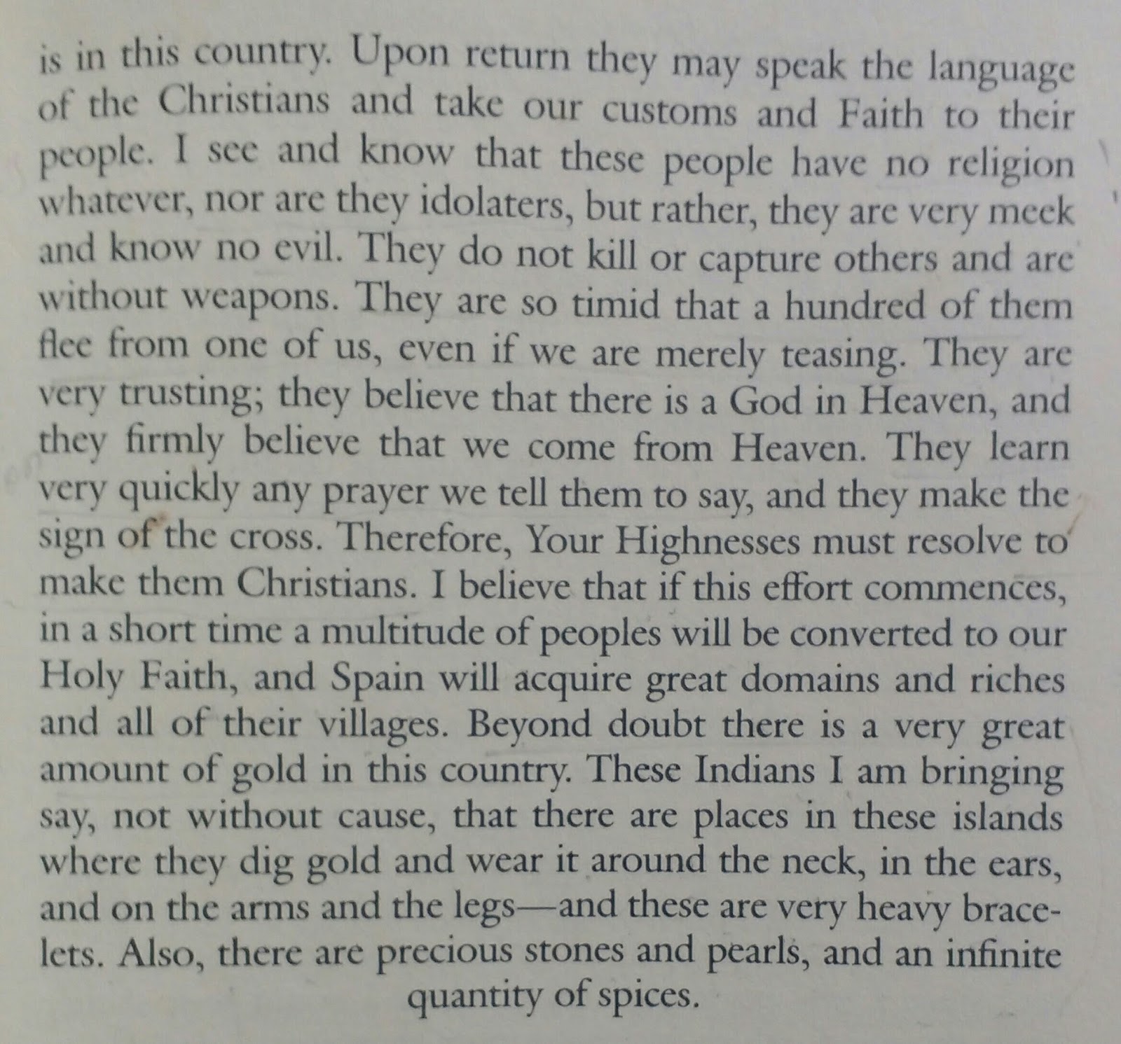 तिथली वनराजी, नद्यांचं पाणी बघून तो हरखून गेला. डायरीत जागोजागी त्याने इथल्या सौंदर्याचं, वनस्पती वैविध्याचं, त्यातून स्पेनला कसा व्यापरात फायदा होऊ शकेल याचं वर्णन केलंय. त्याचा मुख्य शोध होता सोनं. भारत सोन्याची खाण आहे या ज्ञानामुळे इथे कुठे सोनं दिसतंय, कुठल्या आदिवासींना याची माहिती आहे याचा शोध घेत तो आजूबाजूची बेटं आणि मोठा भूप्रदेश शोधत पुढे पुढे जात राहिला. आदिवासीही त्यांच्या बरोबर येऊन आपला भूप्रदेश त्यांना दाखवत होते. त्या बिचाऱ्यांना काय कल्पना; की स्वर्गातून आलेली ही माणसं एक दिवस आदिवासींसाठी नरकाहून भयंकर स्थिती उभी करणार आहेत. आज ज्यांचं स्वागत अतिथी म्हणून करतोय तेच उद्या आपल्याला गुलाम करणार आहेत. त्यांना काय कल्पना की दोन संस्कृतींचा, दोन जगांचा संगम आणि संघर्ष याची ही नांदी होती. कारण भोळेपणाने स्वागत करणऱ्या या लोकांच्याबद्दल कोलंबसाच्या मनात मात्र त्यांना धर्मांतरित करून ख्रिस्ती धर्मप्रचार करण्याची, गुलाम बनवून स्पेनच्या राजाच्या सेवेत आणण्याची स्पष्ट इच्छा होती. कोलंबसाच्या शब्दातच वाचा.
