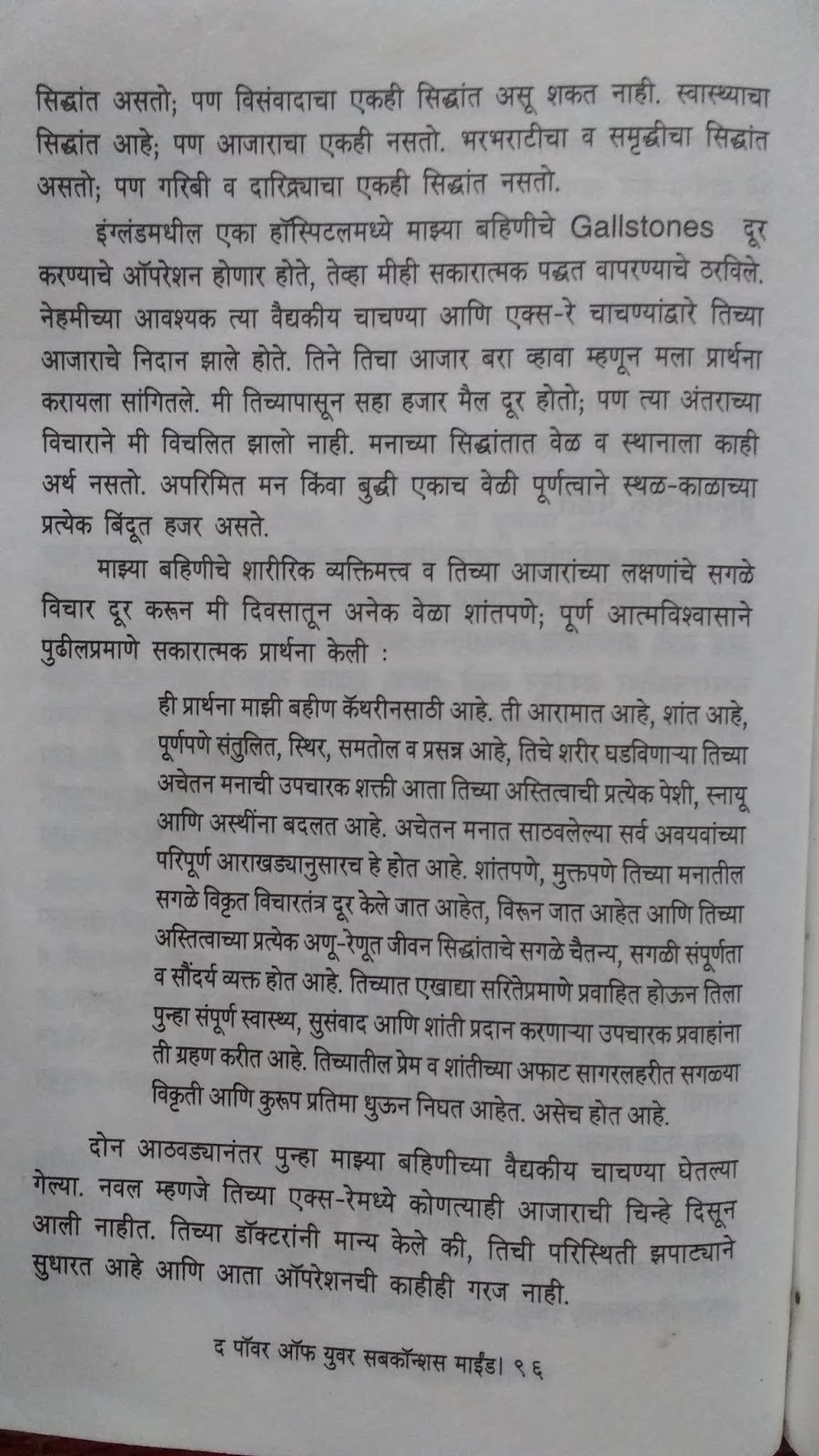 या पुस्तकात लेखकाने स्वतः घेतलेले अनुभव, इतरांनी त्यांना सांगितलेले अनुभव दिलेले आहेत. अशाप्रकारे मनात चांगले विचार आणून, मन शांत करून मनाला योग्य त्या प्रार्थनेची सवय लावून आयुष्यात कसे बदल घडवले याची उदाहरणे आहेत. हे एक उदाहरण वाचा.
