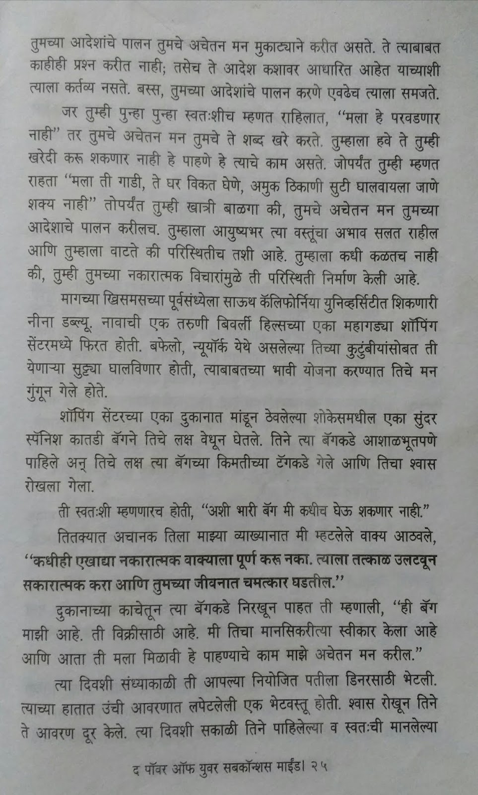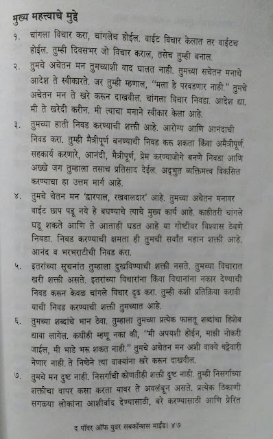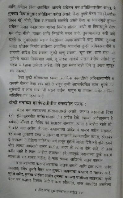 तर तसंही नाहीये. आपल्या मनाला त्याच्या विचारांना खरंच खूप ताकद आहे. या पुस्तकाचे लेखक डॉक्टर मर्फी म्हणतात विचारांना गोष्टी प्रत्यक्ष घडवून आणण्याची ताकद आहे. आपल्या मनाचे चेतन मन आणि अचेतन मन असे दोन भाग आहेत. आणि हे अचेतन मन प्रचंड शक्तिशाली आहे. तुमच्या मनात जे विचार करता, जे स्वप्नचित्र रंगवता ते प्रत्यक्षात उतरवण्याची ताकद तुमच्या मनात आहे. म्हणूनच तुमच्या मनात येणाऱ्या विचारांवर तुमचे नियंत्रण असणे आवश्यक आहे.