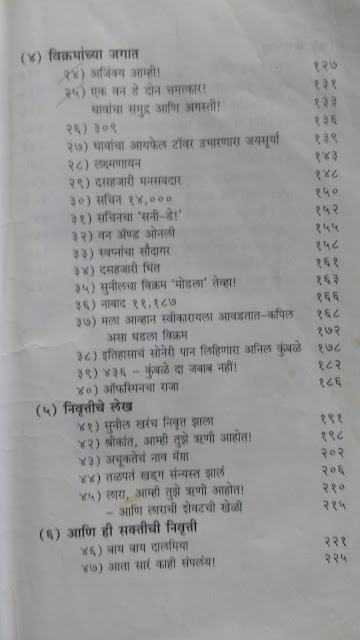 विक्रमांच्या जगात – क्रिकेट जगतात धवा, बळी, शतके, विजय, पराजय यांमध्ये नवनवीन विक्रम प्रस्थापित केले जात असतात, जुने मोडले जात असतात. असे महत्त्वाचे विक्र्म जे गेल्या कही वर्षांत घडले त्या घटनांचे वर्णन करणारे लेख. उदा. मुरलीधरन वरचा “ऑफस्पिनचा राजा” य लेखातला काही भाग.