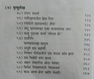 मत्युलेख – हे सुद्धा खेळाडूंच्या कारकीर्दीचा आढावा घेणारे, आठवणी जागवणारे लेख आहेत. पण यात वैशिष्ट्य म्हणजे गुणवत्ता असूनही फार चमकू न शकलेल्या खेळाडूंवर, आणि पूर्वी प्रसिद्ध पण सध्याच्या पिढीला फार माहितीचे नसलेल्या खेळाडूंवरही लेख आहेत. दोन तीन क्रीडा पत्रकारांवरसुद्धा लेख आहेत. उदा. बॉबी तल्यारखान क्रिकेट समालोचक, पत्रकार यांच्या आठवणी :