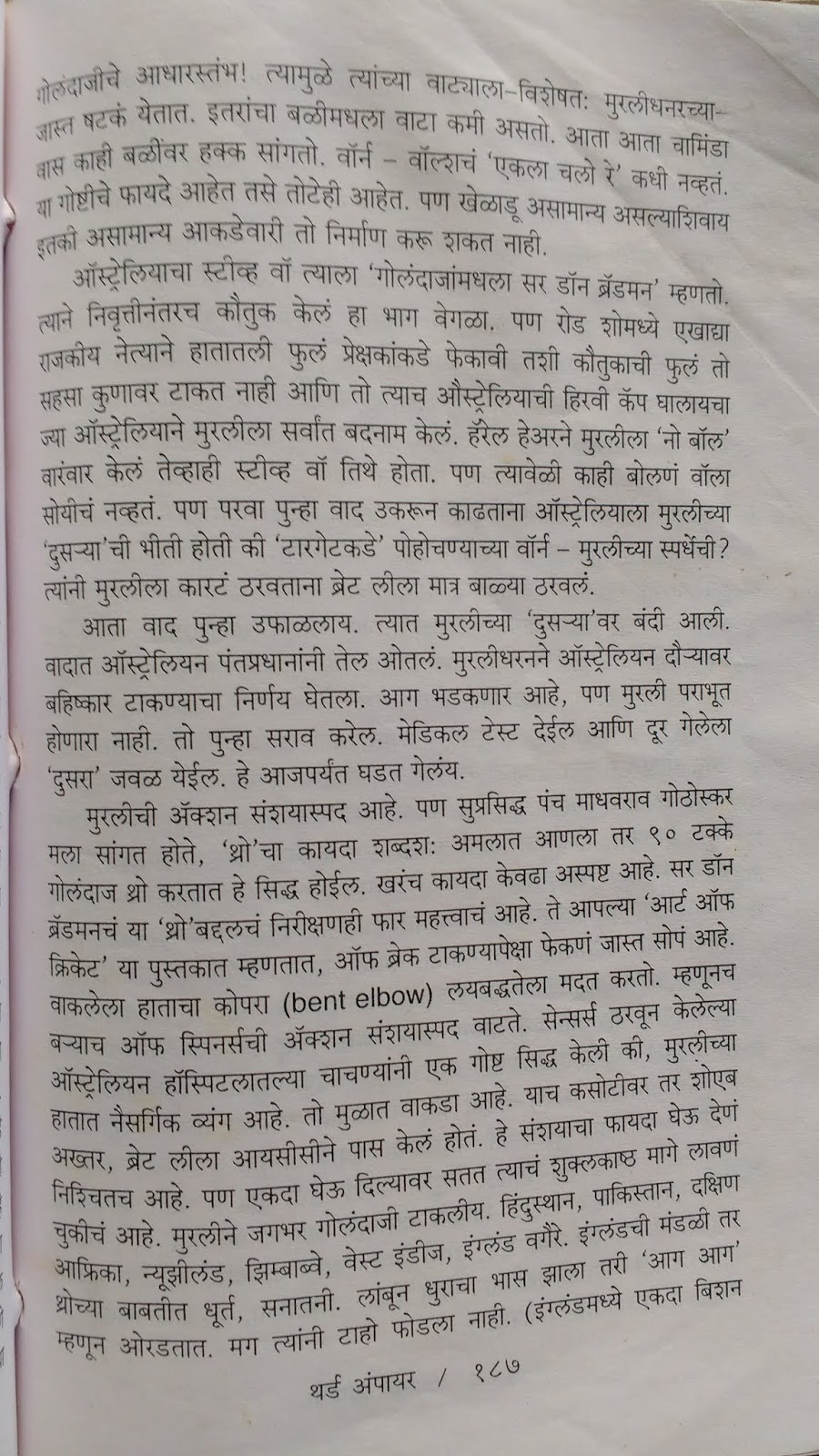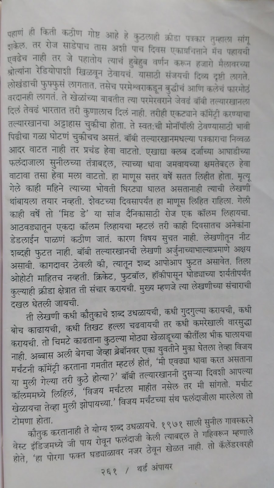 सगळे नियतकालिकांमधले लेख असल्यामुळे थोडेसेच तांत्रिक आहेत. बहुतेक लेख हे आठवणी, किस्से आणि एका क्रिकेट भक्ताने आपल्या “हिरों”वर केलेली शब्दफुलांची उधळण अशा स्वरूपातले आहेत. जर तुम्हाला क्रिकेट आवडत असेल तर हे लेख वाचायला आवडतील. नवीन किस्से कळतील. काही प्रसंगांच्या पुनःप्रत्ययाचा आनंद मिळेल. विरंगुळा म्हणून वाचायला छानच आहे. क्रिकेट नसेल आवडत (माझ्यासारखं) तरी पुस्तक चाळा. “होम ग्राउंड”, “माजी मास्टर्स” आणि “मृत्यूलेख” विभागातले काही लेख वाचायला आवडतील. एखाद्या क्षेत्रात महान व्यक्तिमत्त्व कसं तयार होतं हे वाचणंसुद्धा उद्बोधक आहे.