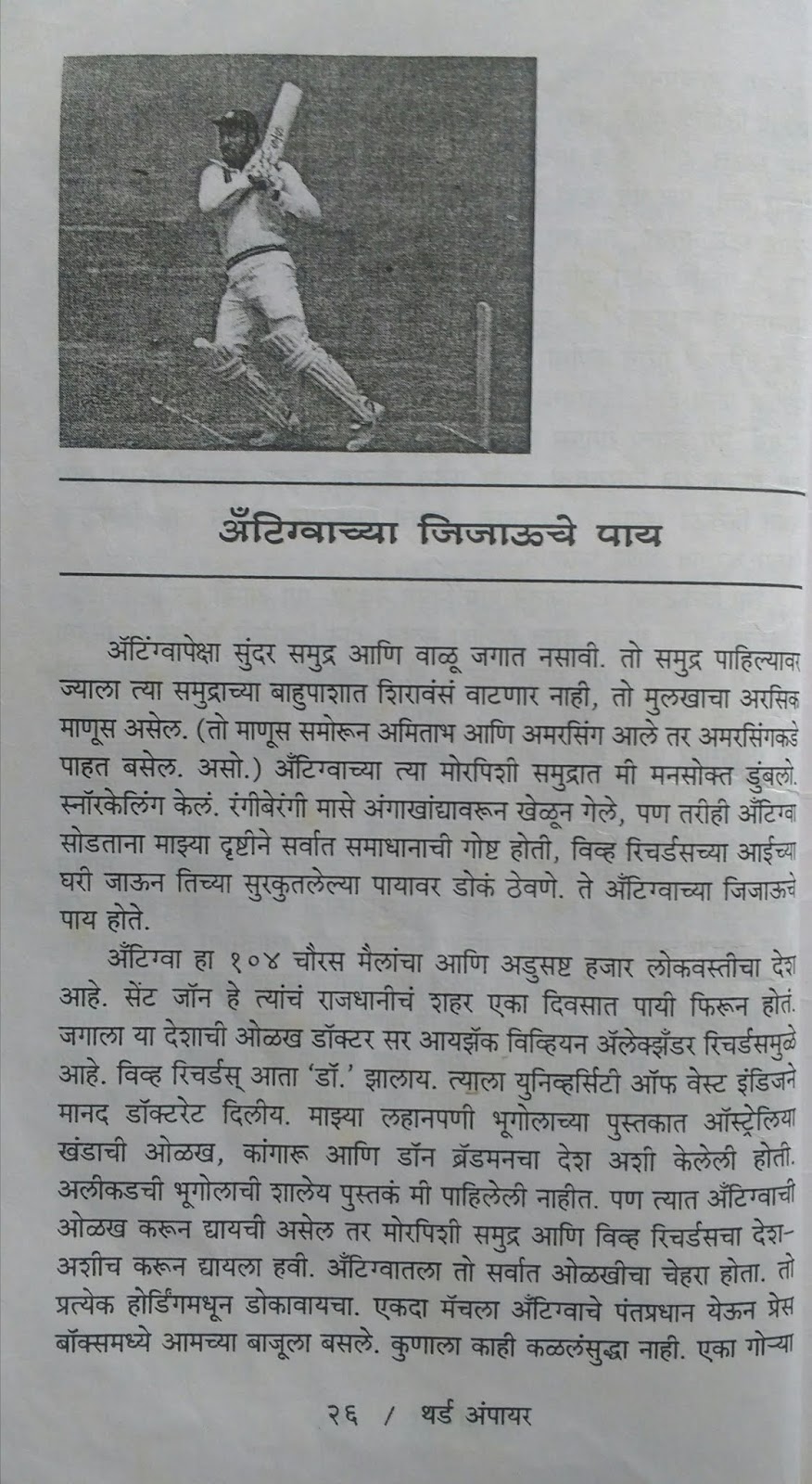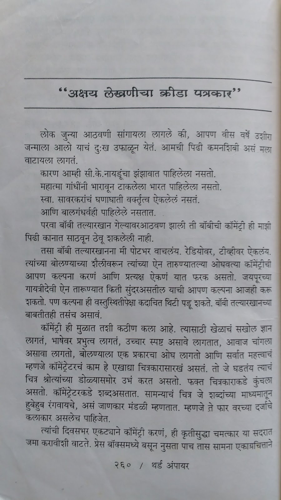 माजी मास्टर्स – नावावरून्च लक्षात येत असेल की क्रिकेट मधल्या दिग्गज खेळाडूंचे गुणवर्णन करणारे हे लेख आहेत. ब्रॅडमन, विश्वनाथ, मेंडीस, कुंबळे, देवधर इ. वर लेख आहेत.