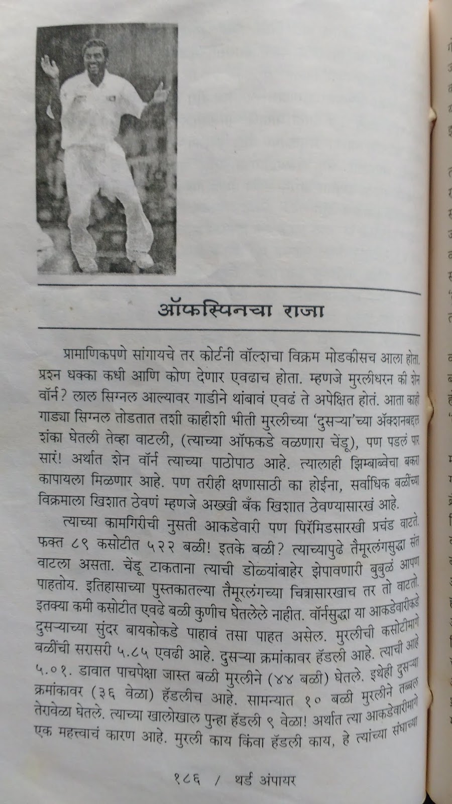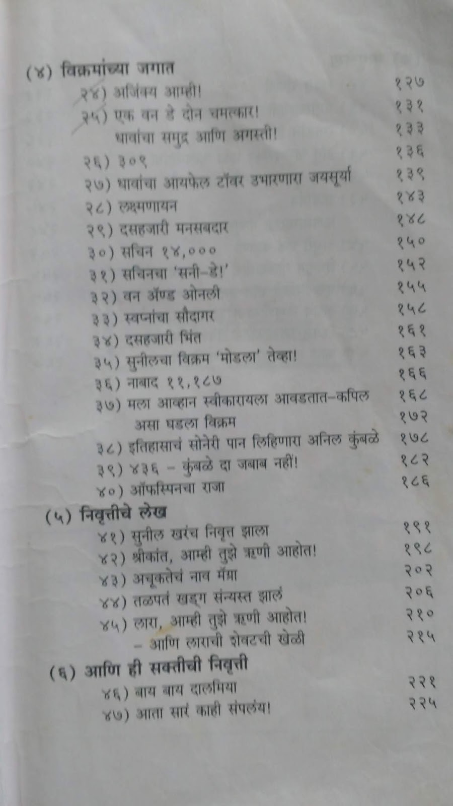विक्रमांच्या जगात – क्रिकेट जगतात धवा, बळी, शतके, विजय, पराजय यांमध्ये नवनवीन विक्रम प्रस्थापित केले जात असतात, जुने मोडले जात असतात. असे महत्त्वाचे विक्र्म जे गेल्या कही वर्षांत घडले त्या घटनांचे वर्णन करणारे लेख. उदा. मुरलीधरन वरचा “ऑफस्पिनचा राजा” य लेखातला काही भाग.