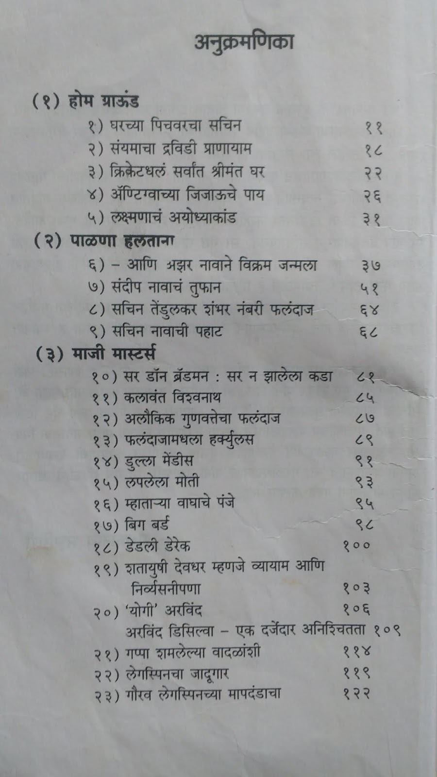 पालणा हलताना – यशस्वी खेळाडूंच्या क्रिकेट क्षेत्रात पदार्पण होत असताना ते कुठे खेळले, कसे खेळले, तो खेळ बघून तत्कालीन लोकांच्या प्रतिक्रिया आणि भकितं काय होती याचा मागोवा घेणारे लेख. उदा. क्रिकेटचा देव मानल्या जाणाऱ्या सचिनच्या रणजी पदार्पणाचा हा अनुभव.