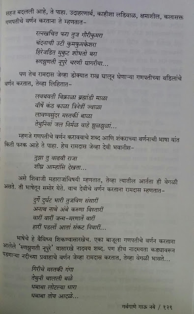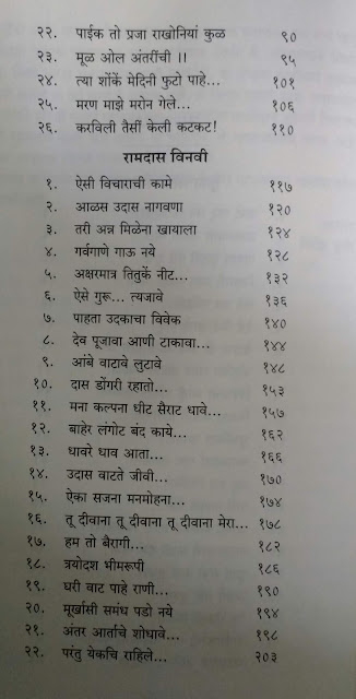 रामदास स्वामींवरचे लेख हे चरित्रात्मक नसून त्यांच्या वाङ्मयावर आधारित आहेत. एकात त्यातही त्यांची भक्ती, अध्यात्म, धार्मिकता यापेक्षा सर्वसामान्य जीवनाबद्दल त्यांनी केलेला उपदेश यावर भर आहे. आजच्या काळातही तो उपदेश किती चपखल लागू पडतो ते मांडलं. आहे. दुसऱ्या प्रकारच्या लेखांत त्यांच्या साहित्याचे रसग्रहण आहे. रामदासांचे “मनाचे श्लोक” आणि “दासबोध” प्रसिद्ध आहेतच पण त्याबरोबरच त्यांनी अभंग, डफगाणी, दंडीगाणी इतकंच काय लावण्याही लिहिल्या आहेत हा फारसा प्रचलित पैलू नसलेला आपल्यासमोर आणला आहे. रामदास स्वामींनी दख्खनी उर्दू,हिंदी कानडी इ. भाषांतही त्यांनी रचना केली आहे, ही माहिती माझ्यासाठी नवीनच होती. एक कवी म्हणून त्यांनी वेगवेगळी वृत्ते, छंद यांमध्ये यांचा वापर कसा केला आहे; “भीमरूपी महारुद्रा..” सारखी अजून १३ स्तोत्रे त्यांनी रचली आहेत त्याच्यातही रचना वैविध्य आहे. हे पण मला नवीन होतं.