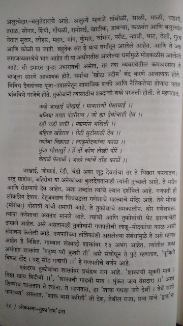 तुकारामांवरच्या लेखात त्यांचे चरित्र मांडले आहे. त्यांच्या वेळची सामाजिक स्थिती, मुसलमानी आक्रमणाचा वरवंटा, जातिभेदात दुभंगलेला आणि कर्मकांडात गुरफटलेला समाज कसा होता याचे वर्णन आहे. या परिस्थितीला धक्का देण्याचे काम, समाजप्रबोधनाचं काम त्यांनी कसं केलं हे विशद केलं आहे. त्यावेळच्या सनातन्यांनी आणि इतर जातीतल्या धर्माभिमान्यांनी त्यांना त्रास दिला त्याचे ऊहापोह आहे. “गाथा तरल्या” आणि “सदेह वैकुंठगमन” हे तुकारामांबद्दलचे दोन प्रसिद्ध चमत्कार. ते चमत्कार का भाकडकथा ? याची चर्चा आहे. बऱ्याच लेखांत इतर संशोधकांची मते, अस्सल कागदपत्रे काय म्हणतात, तत्कालीन संत उदा. बहिणाबाई, त्यांचे बंधू कान्होबा हे आपल्या अभंगातून त्या त्या प्रसंगांचे वर्णन कसे करतात या आधारे तर्कशुद्ध मांडणी करायचा प्रयत्न केला आहे. तुकारामांची रूढ प्रतिमा म्हणजे भोळसट, व्यवहारात कच्चा, देवभक्त वाणी अशी असते. प्रत्यक्षात ते प्रपंचदक्ष होते आणि परिस्थिती विरुद्ध बंडखोरी करणारे कसे होते हे या उदाहरणांतून मांडायचा प्रयत्न केला आहे.