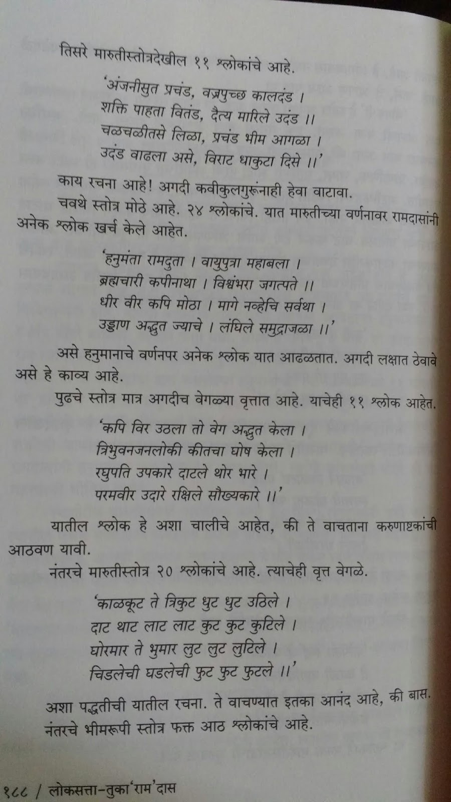 रामदास स्वामींवरचे लेख हे चरित्रात्मक नसून त्यांच्या वाङ्मयावर आधारित आहेत. एकात त्यातही त्यांची भक्ती, अध्यात्म, धार्मिकता यापेक्षा सर्वसामान्य जीवनाबद्दल त्यांनी केलेला उपदेश यावर भर आहे. आजच्या काळातही तो उपदेश किती चपखल लागू पडतो ते मांडलं. आहे. दुसऱ्या प्रकारच्या लेखांत त्यांच्या साहित्याचे रसग्रहण आहे. रामदासांचे “मनाचे श्लोक” आणि “दासबोध” प्रसिद्ध आहेतच पण त्याबरोबरच त्यांनी अभंग, डफगाणी, दंडीगाणी इतकंच काय लावण्याही लिहिल्या आहेत हा फारसा प्रचलित पैलू नसलेला आपल्यासमोर आणला आहे. रामदास स्वामींनी दख्खनी उर्दू,हिंदी कानडी इ. भाषांतही त्यांनी रचना केली आहे, ही माहिती माझ्यासाठी नवीनच होती. एक कवी म्हणून त्यांनी वेगवेगळी वृत्ते, छंद यांमध्ये यांचा वापर कसा केला आहे; “भीमरूपी महारुद्रा..” सारखी अजून १३ स्तोत्रे त्यांनी रचली आहेत त्याच्यातही रचना वैविध्य आहे. हे पण मला नवीन होतं.