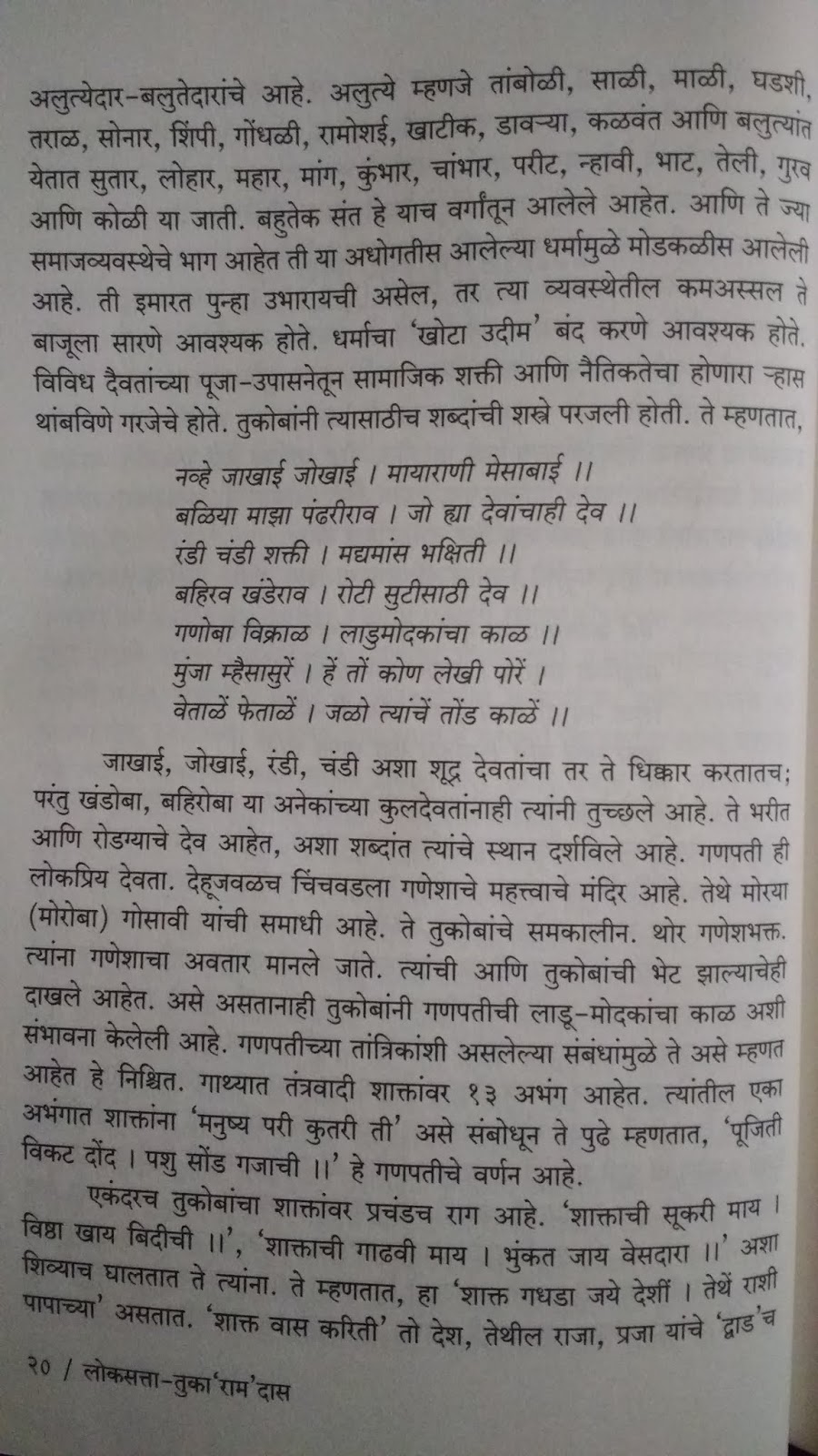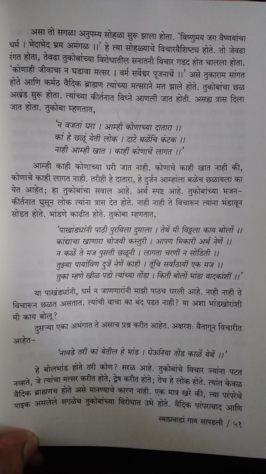 दोन्ही संतांची भाषा चारशे वर्षं जुनी असल्याने सगळेच शब्द नीट कळत नाही. मराठी असूनही काही वेळा दुर्बोध वाटते. लेखांमध्ये या अभंगांचे, ओव्यांचे मराठीत शब्दशः भाषांतर द्यायला हवे होते.म्हणजे त्याच्या आजुबाजूचे विवरण अजून चांगलं समजलं असतं. वृत्तपत्रातल्या शब्दमर्यादेमुळे तेव्हा ते शक्य झाले नसेल पण पुस्तकात तसे देणे जमले असते. तळटीपांच्या स्वरुपात दिले असते तर लेखाचा ओघही बिघडला नसता.